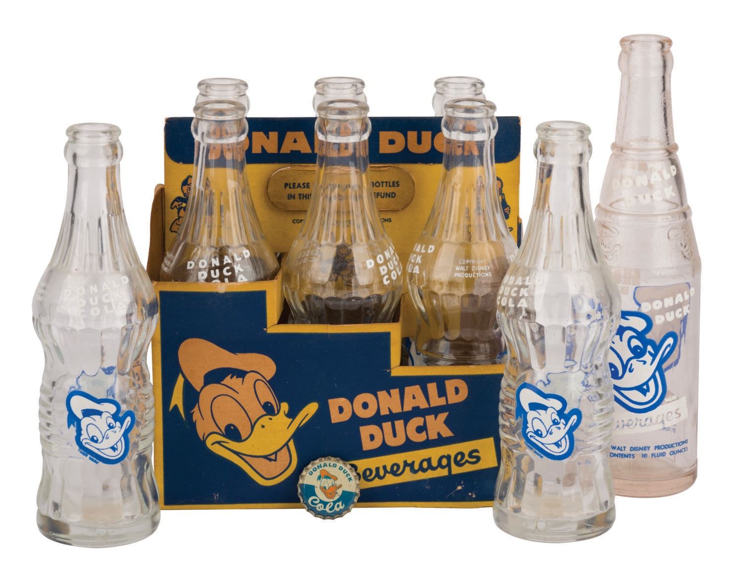 (Commercial Beverage Co.,1940s/50s) A collection of Donald Duck Cola & Beverages bottles. The lot includes (8) Donald Duck Cola bottles, six-pack carrier, bottle cap, and one Donald Duck Beverages bottle. The bottles measure 8" to 9.25" tall, the carrier is 7.5"x7.25" and 5" wide, and the cap is 1.25" in diameter. The bottles, carrier, and cap are in overall very good condition, despite slight wear and tear to the carrier and minor oxidation to the cap.