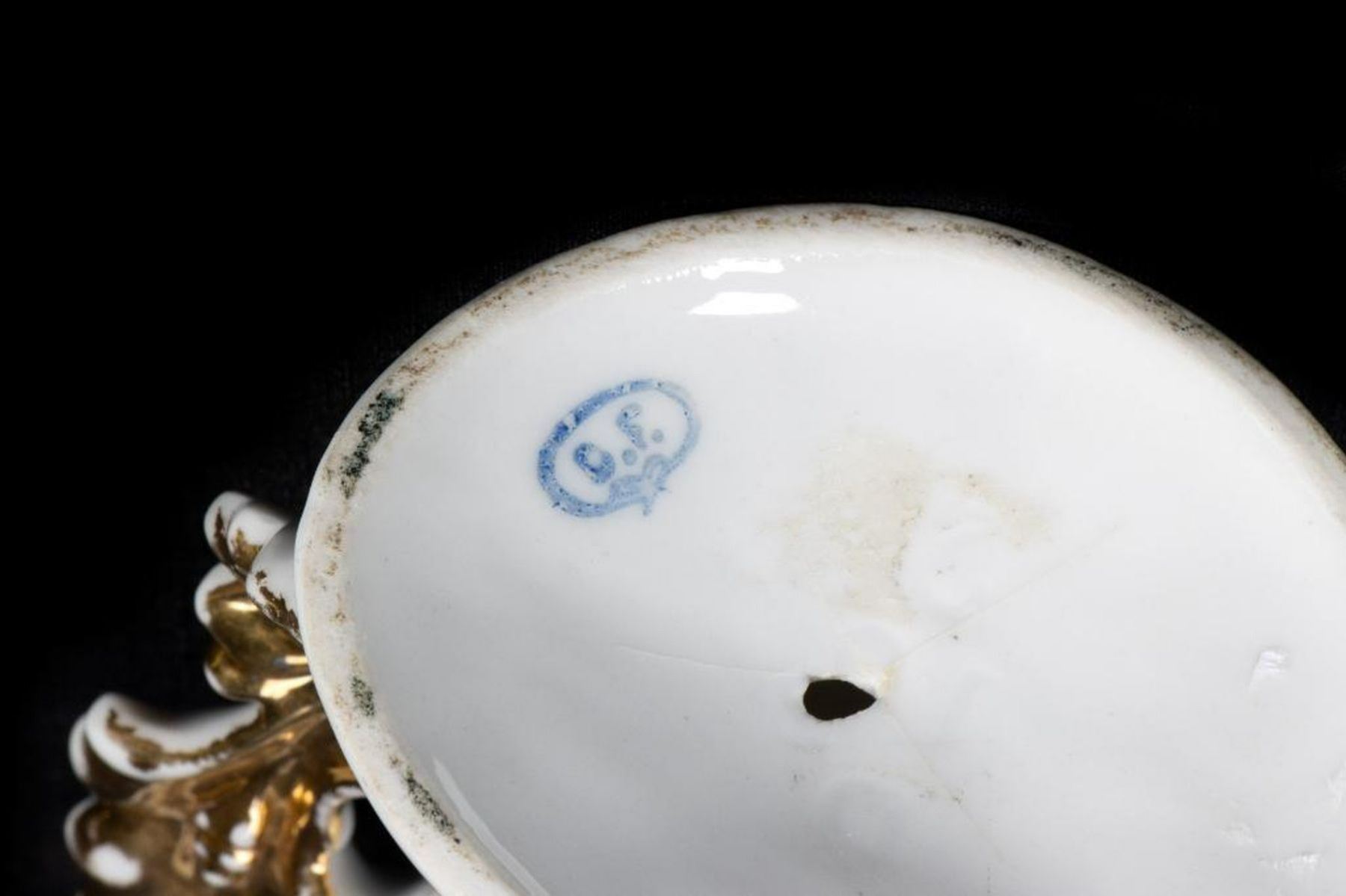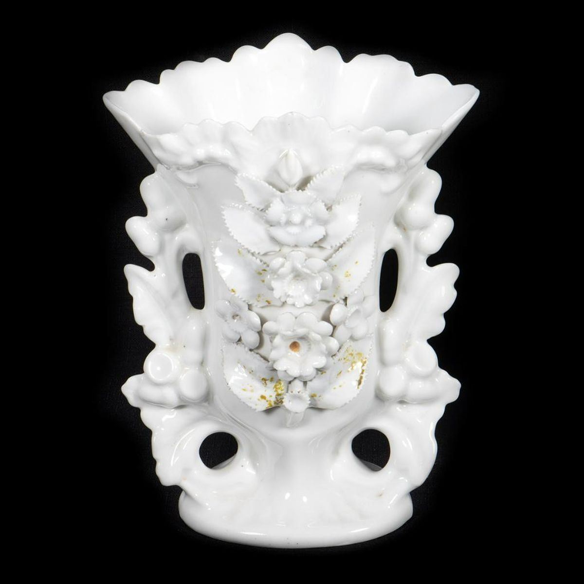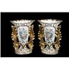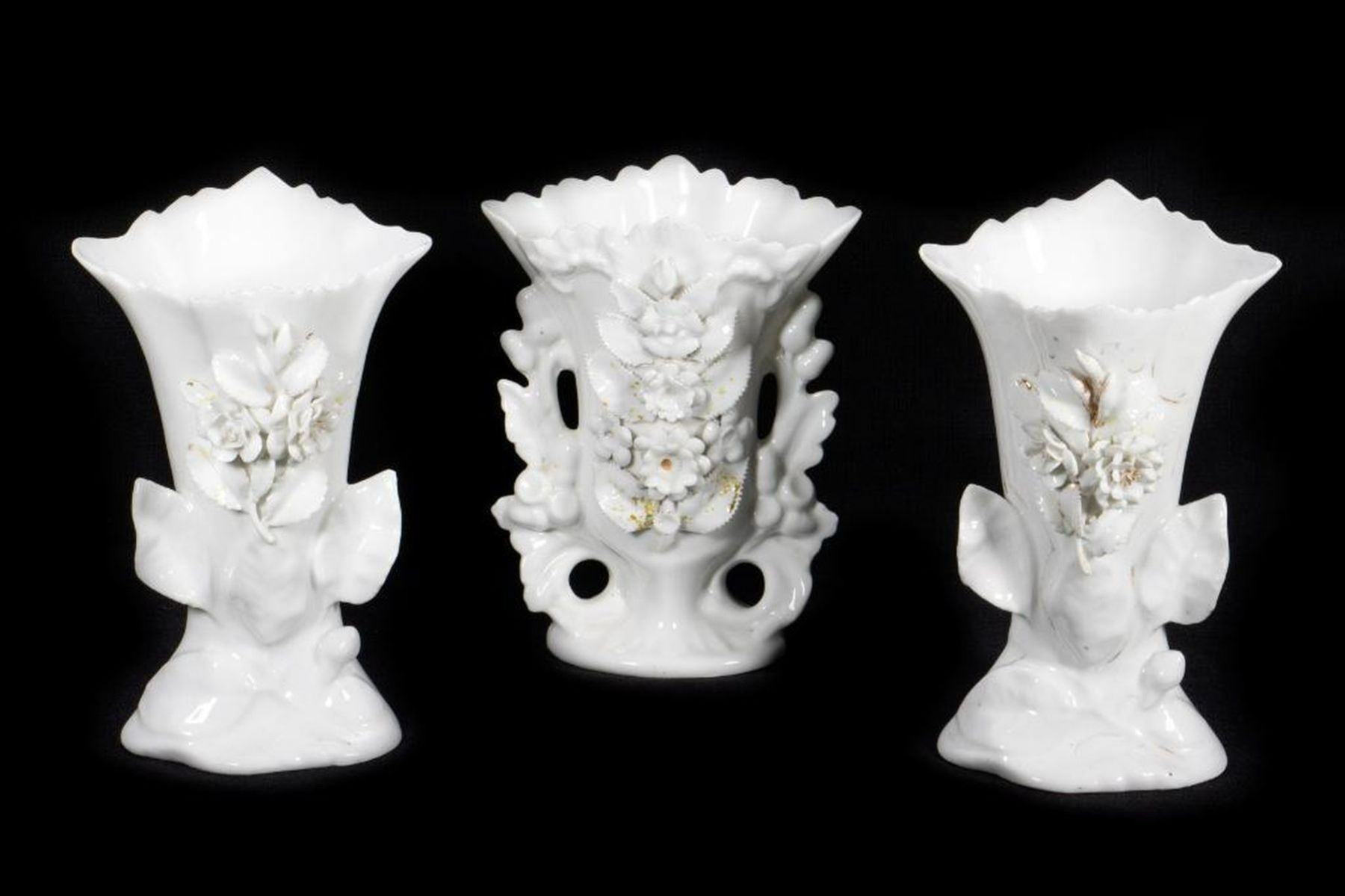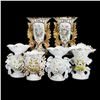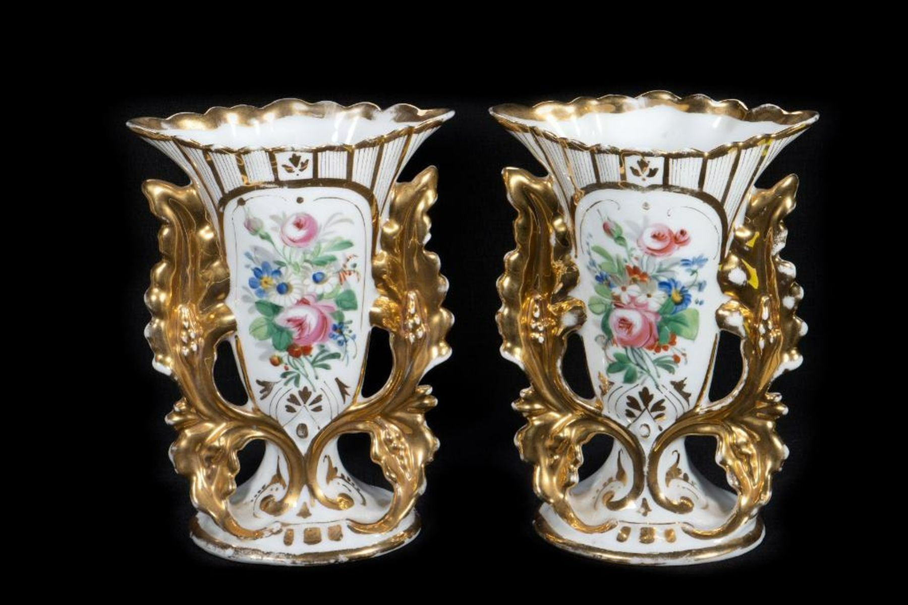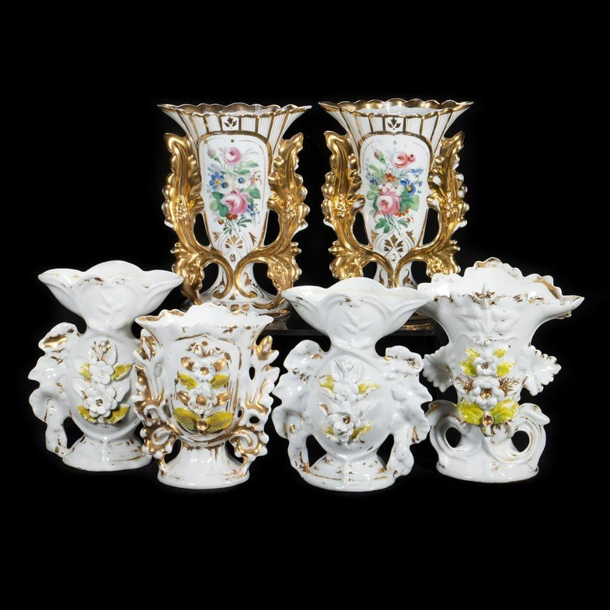 The flared-form vases are comprised of a hand-painted floral gilt pair, two applied flower pairs, and three similar with applied flowers. Most unmarked, or with numbers only; the painted pair with blue stamped "CF" in a ribbon-tied circle; two stamped "L L" with incised script "J. O."; one stamped "CF", Tallest is 8in. Condition: except for the floral painted pair, all have heavy wear/loss to gilt/color.