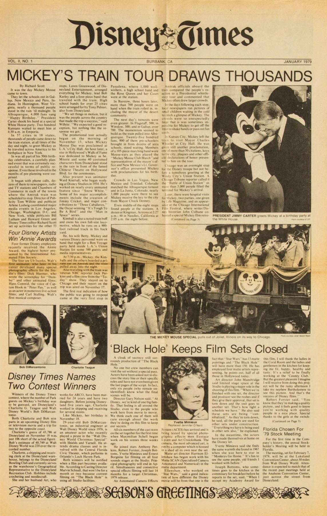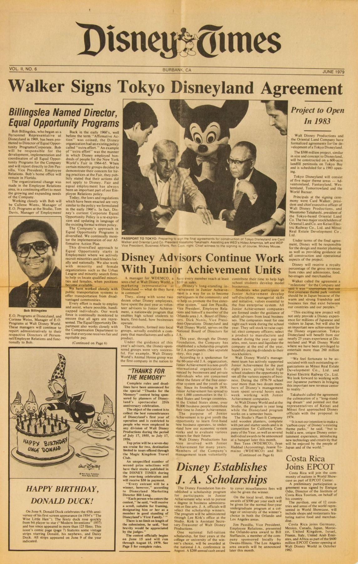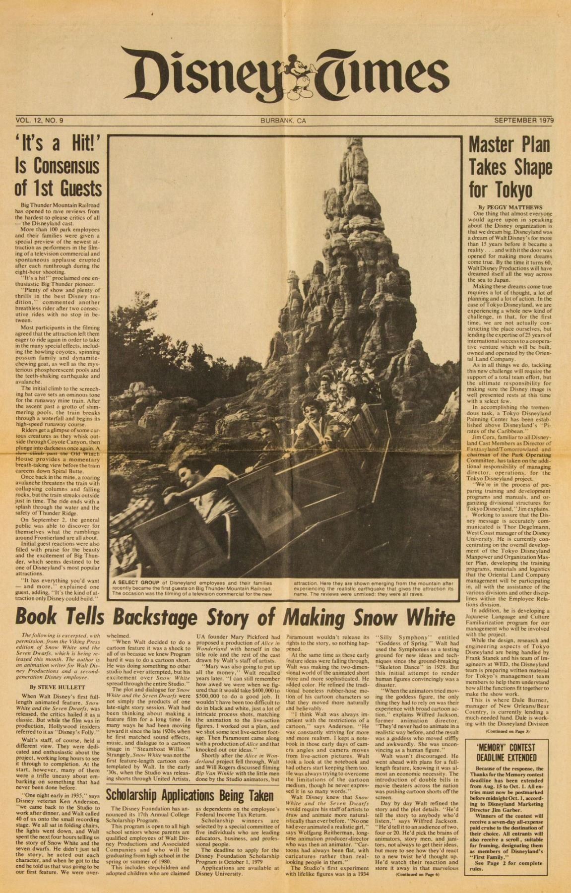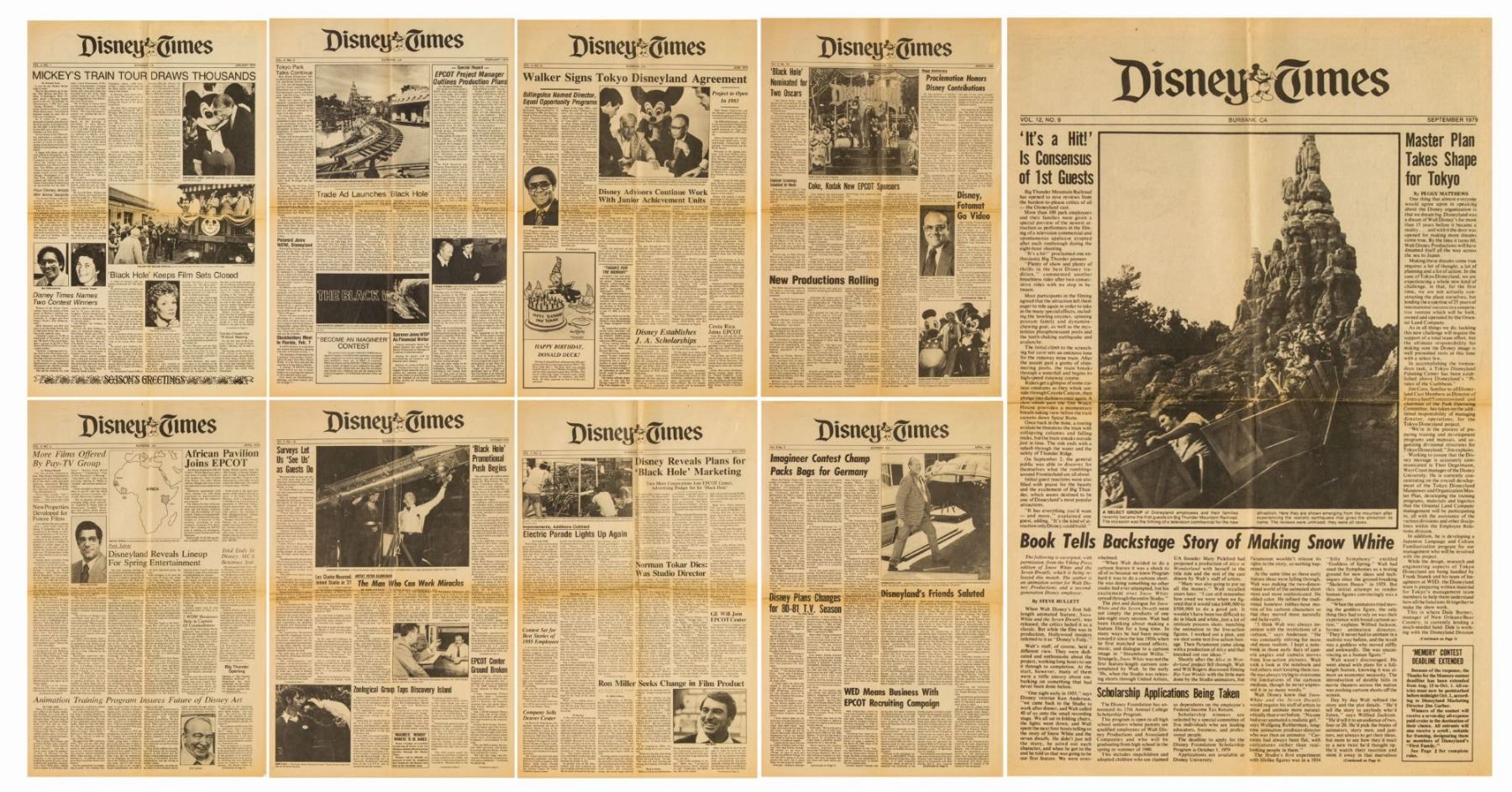 (Walt Disney Studios, 1979/80) A collection of 9 issues of "Disney Times" newspaper created between January 1979 and April 1980. These newspapers feature articles on events at both the theme parks and studios, covering topics such as new attractions, the development of EPCOT and Tokyo Disney, and Mickey's 50th Birthday. The issues measure 22.75"x13.5" when unfolded and are in very good condition, with some wear along the fold-lines, minor discoloration, and some edge-wear.