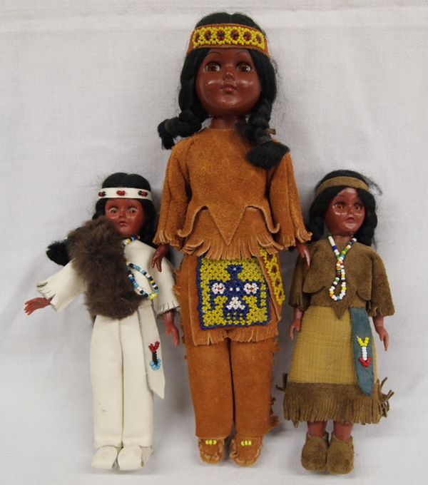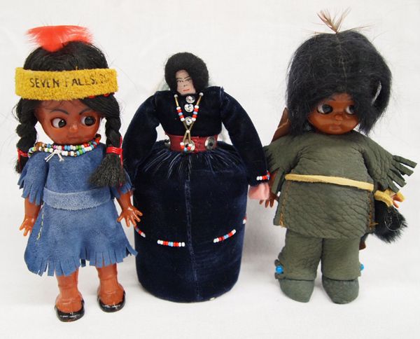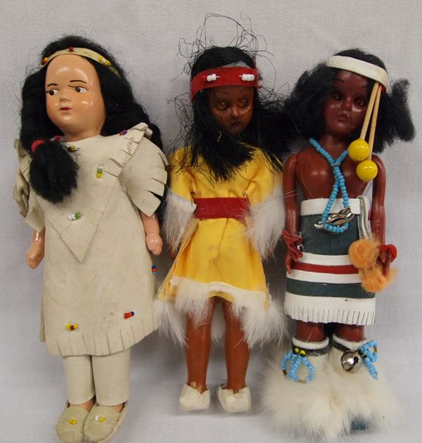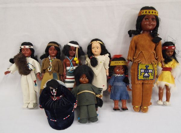 Collection of 9 Native American Dolls, largest measures 10.5'' tall, some sleepy eye, some partially jointed, includes 1 Navajo Pincushion Doll, Great detail on each of their costumes.