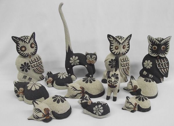 Collection of 9 Wooden Hand Carved Cats, 3 Owls. Carved of Albezian wood and coated with natural Bali sands. Largest measures 6.5'' x 3.75''W. Some are standing, some in repose. The black sand sparkles adding a touch of wonder to the pieces.