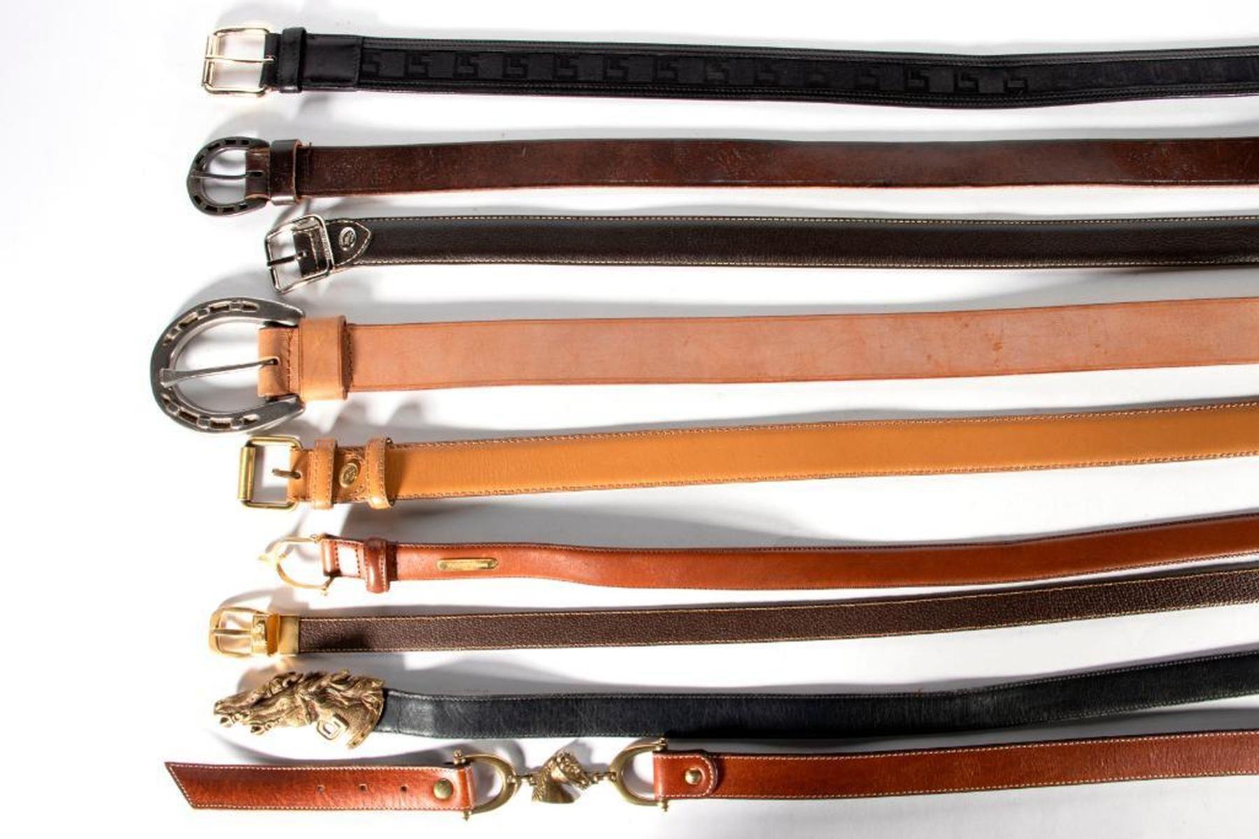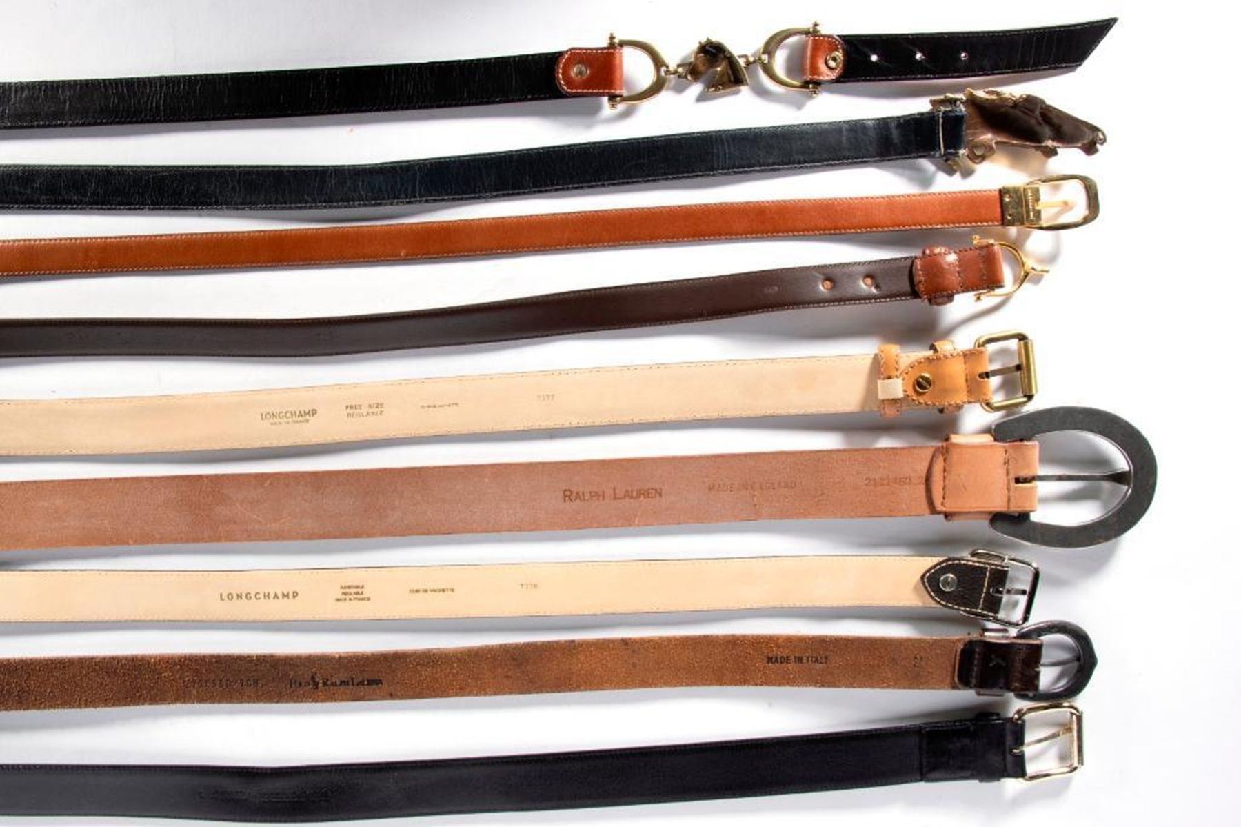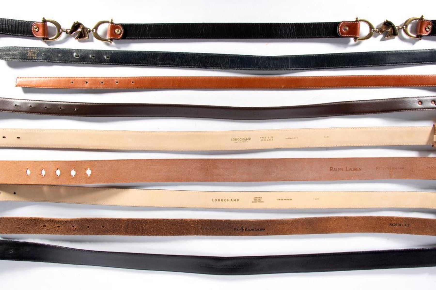 including: Longchamps tan, 29-33in., Longchamps dark brown, 30-34in., Ralph Lauren brown stirrup, 27-31in., Ralph Lauren dk brown horseshoe, 25-29in., Ralph Lauren tan large horseshoe, 26-30in., Gucci black horse head, 26-30in., in addition to one by St. John and two unsigned.