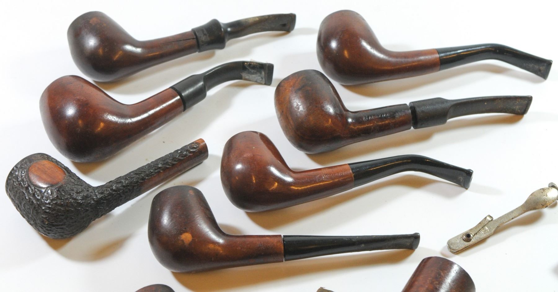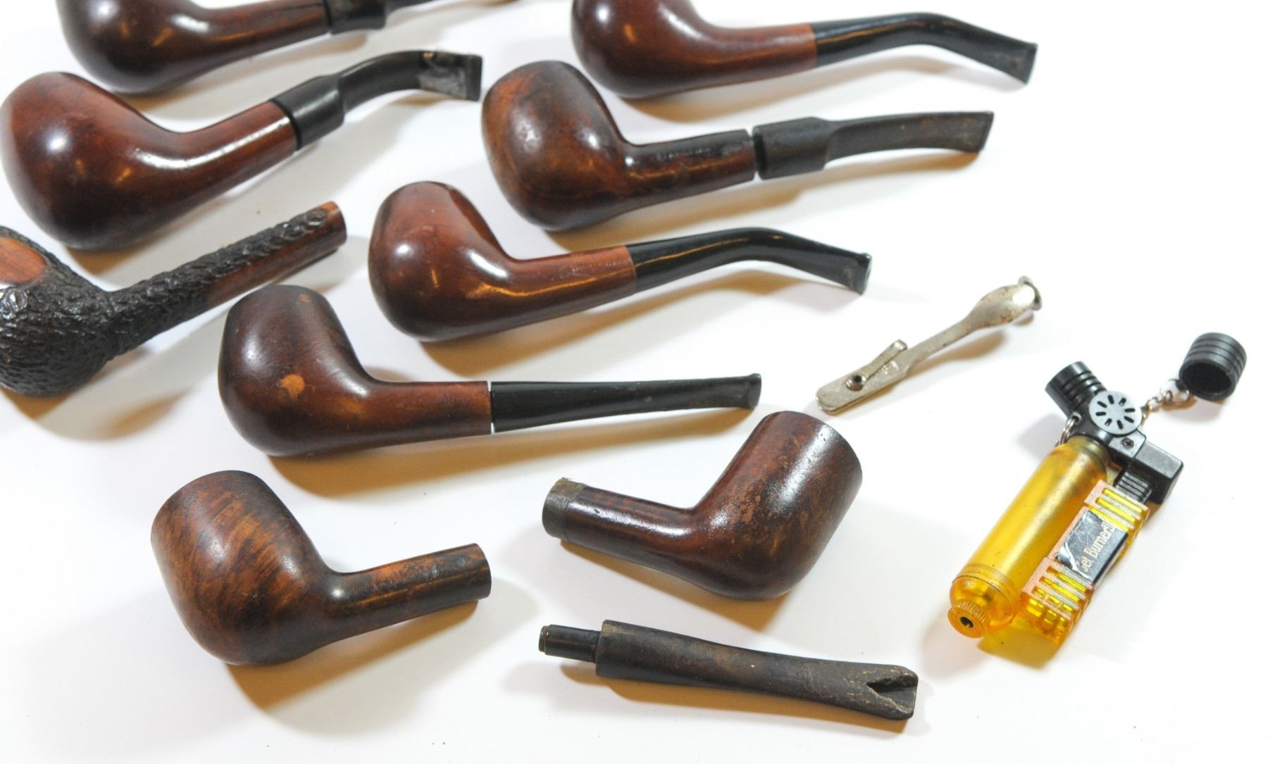 Collection of 9 old briar wood pipes, with maker's marks, including 5 pipes by Pipsan, 2 pipes by Shalom and two additional pipes signed 'real briar'. With an addition of lighter and tobacco cutter