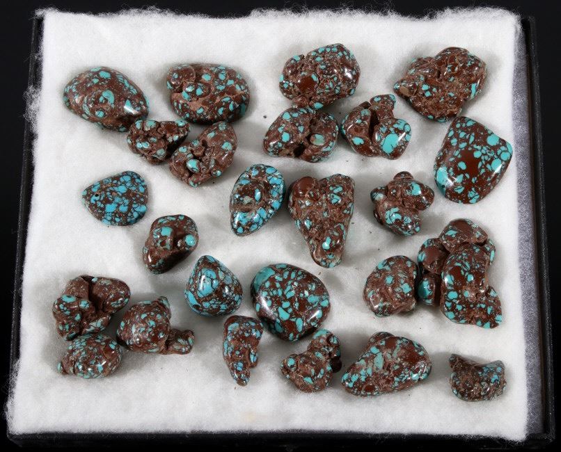 Featured in this lot we have a collection of uncut turquoise nuggets weighing a total of 904 carats. The collection consists of 25 pieces of turquoise nuggets. The nuggets are of Apache Blue turquoise and are uncut. The collection is in good condition and comes with a display case. The case measures 7 1/4" wide by 6" tall.