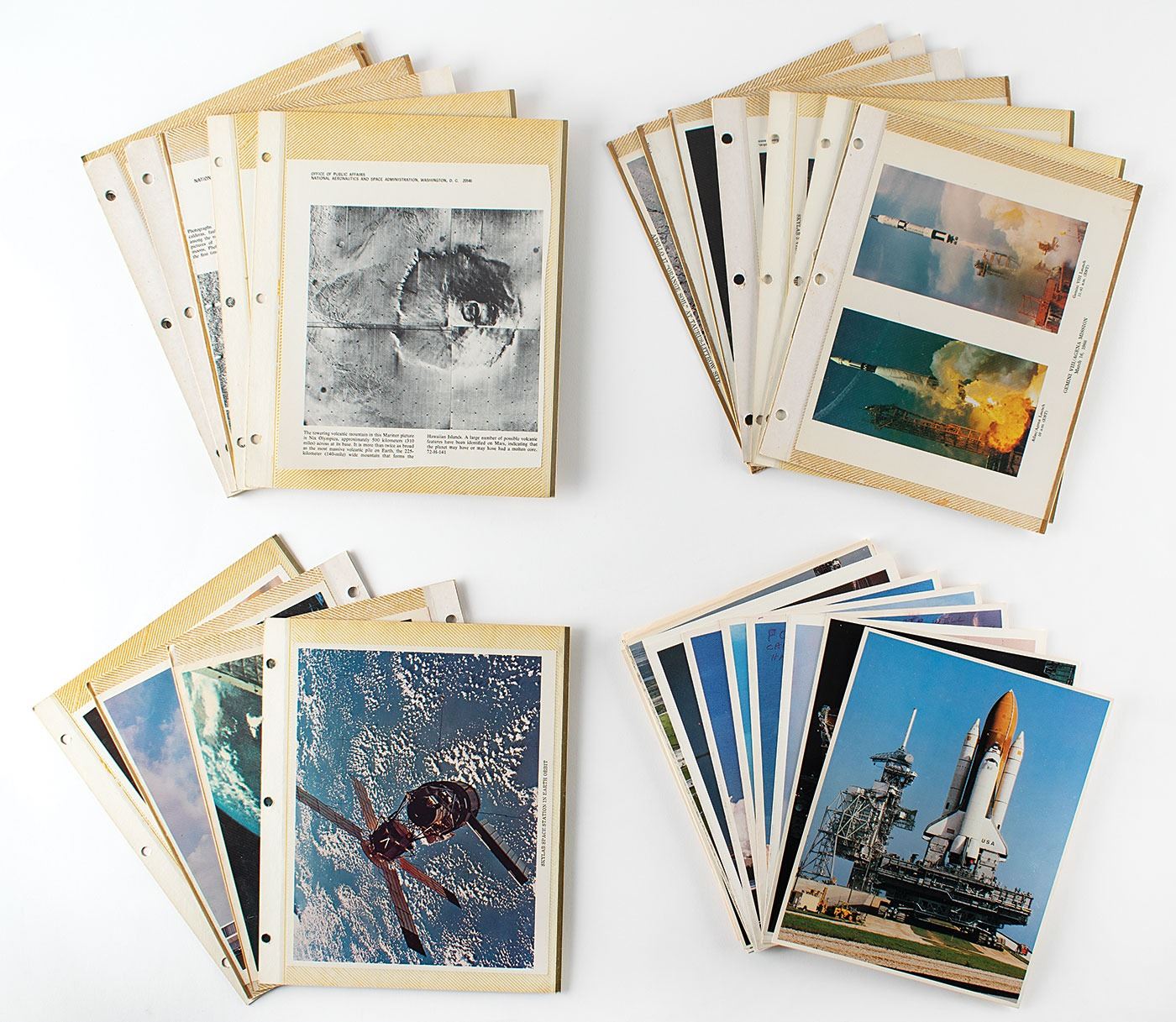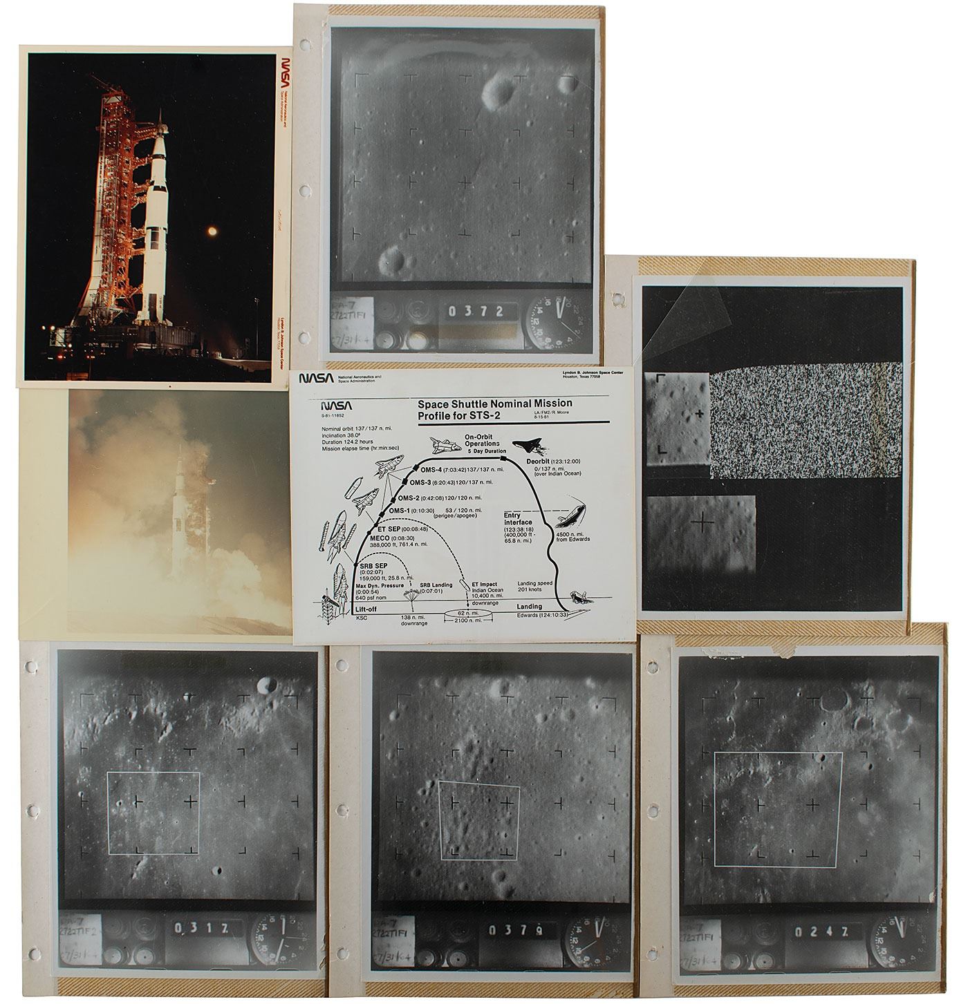 Collection of 97 space images, consisting mostly of official NASA lithographs from throughout its history. Highlights include: two official color glossy red-numbered NASA photos of the Apollo 12 Saturn V rocket at Launch Complex 39; an official glossy photo of the nominal mission profile for STS-2; and ten glossy photos of the lunar surface, evidently taken by Ranger 7 in 1964, all affixed to scrapbook pages. The remainder of the lot is comprised mostly of lithographs from the Space Shuttle program, as well as thirteen Mariner 9 lithographs (all with irregularly trimmed edges, affixed to scrapbook pages) and a few Gemini and Apollo lithographs. In very good condition, with diagonal stripes of toning to reverse of most, trimmed edges to many, and many of the earlier photos and lithographs affixed to double-sided scrapbook pages.