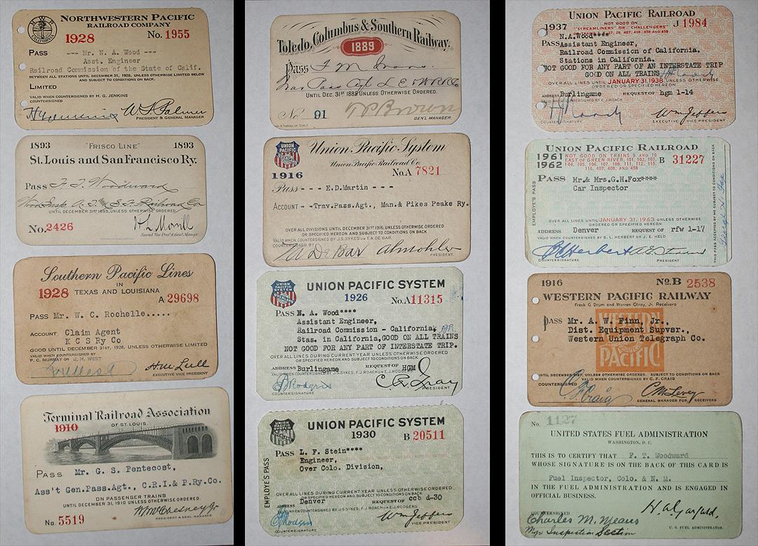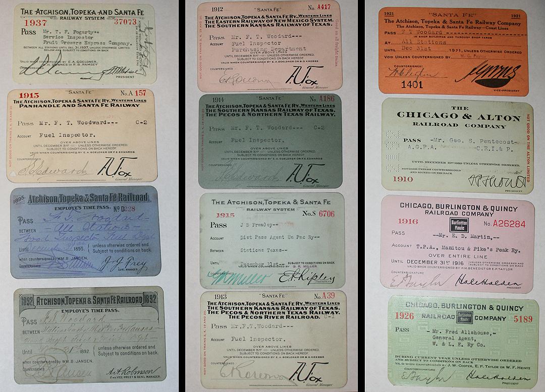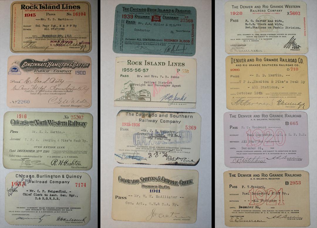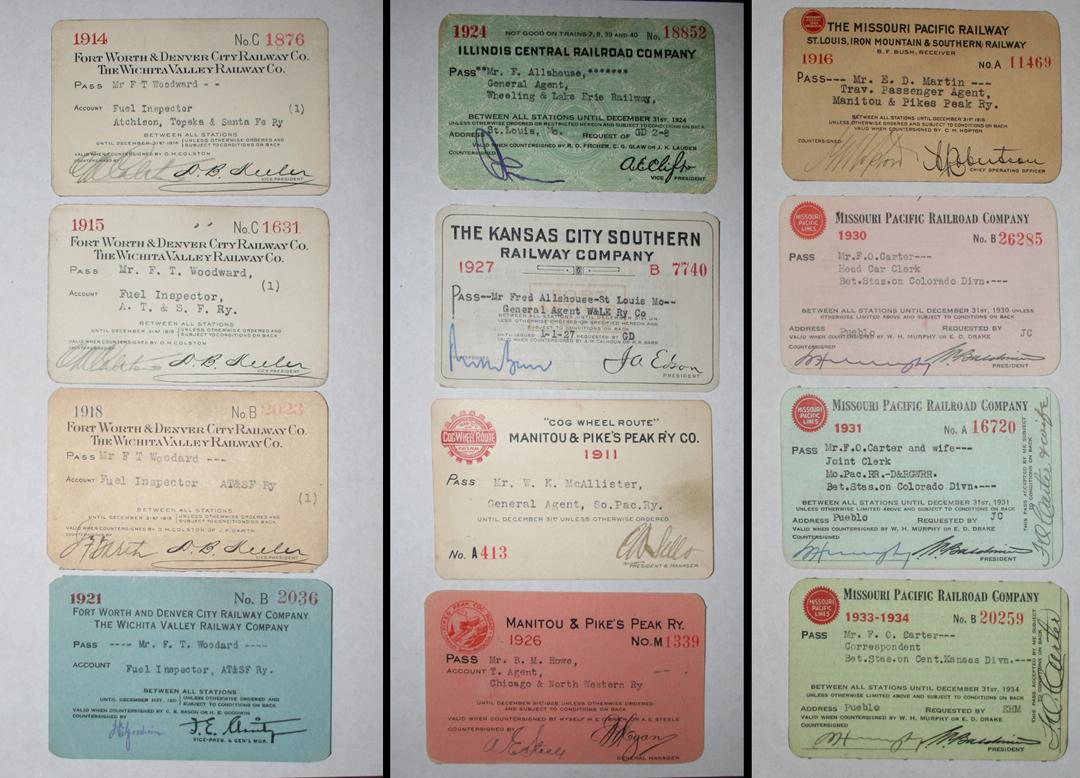 Collection of 98 Early Railroad Passes, the earliest is dated 1892. Issued by: The Atchison, Topeka & Santa Fe Railroad, The Chicago & Alton Railroad Co., The Chicago, Burlington & Quincy Railroad Co., Rock Island Lines, Cincinnati, Hamilton & Dayton Railway Co., Chicago & North Western Railway, The Chicago, Rock Island & Pacific Railway Co., The Colorado & Southern Railway Co., Colorado Springs & Cripple Creek District Railway Co., The Denver & Rio Grande Railroad, The Denver & Rio Grande Western Railroad Co., Denver & Salt Lake City Railroad Co., El Paso & Southwestern, Fort Dodge, Des Moines & Southern Railroad Co., Forth Worth & Denver City Railway Co., The Wichita Valley Railway Co., Illinois Central Railroad Co., The Kansas City Southern Railway Co., Manitou & Pikes Peak Railway Co., The Missouri Pacific Railway Co., St. Louis, Iron Mountain & Southern Railway, Northwestern Pacific Railroad Co., St. Louis & San Francisco Railway, Southern Pacific Lines, Terminal Railroad Association of St. Louis, Toledo, Columbus & Southern Railway, Union Pacific Railroad, Western Pacific Railway, United States Fuel Administration, The Western Union Telegraph Co., Santa Fe Eating System Houses, The Chicago, Rock Island & Gulf Railway Co., Missouri-Kansas-Texas Lines, Great Northern Railway Co., St. Louis, San Francisco & Texas Railway Co., Fort Worth & Rio Grande Railway, The Texas & Pacific Railway Co., Southern Pacific Co., & Frisco. All stored in protective sleeves.