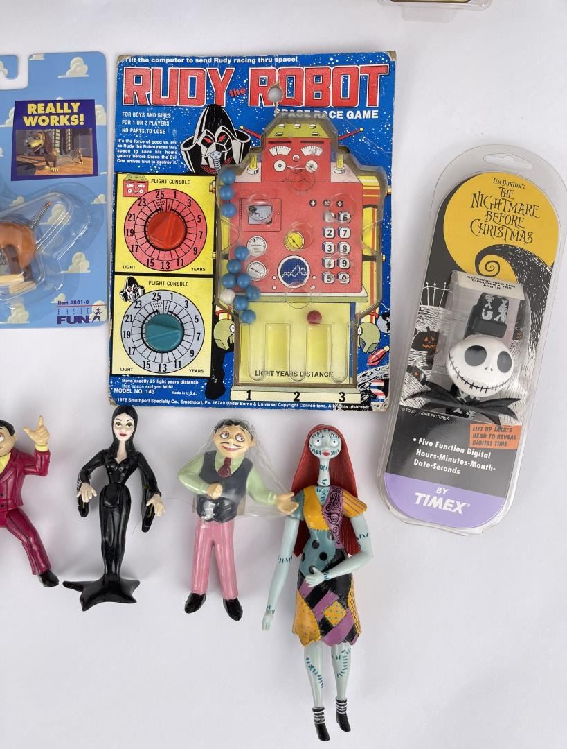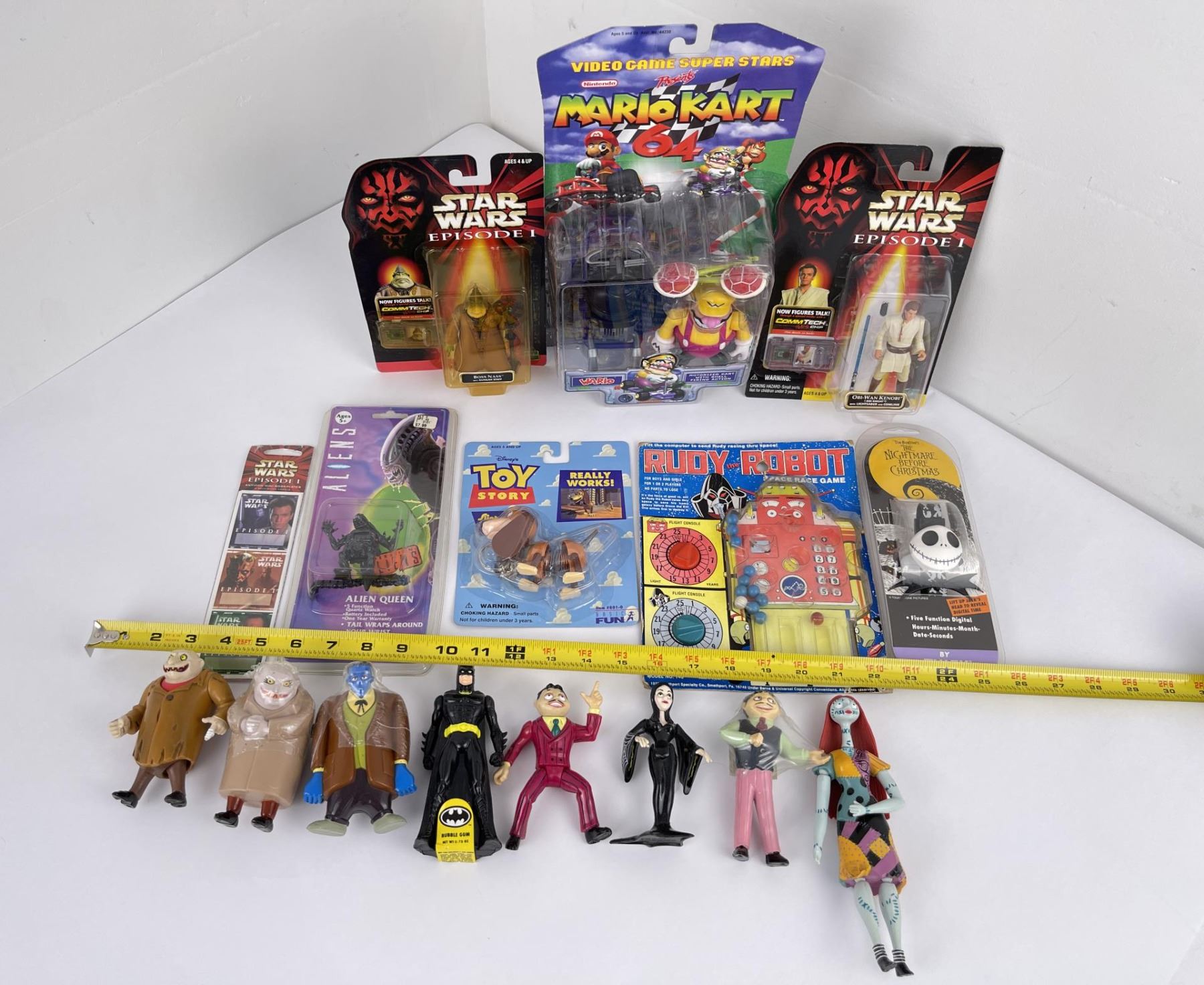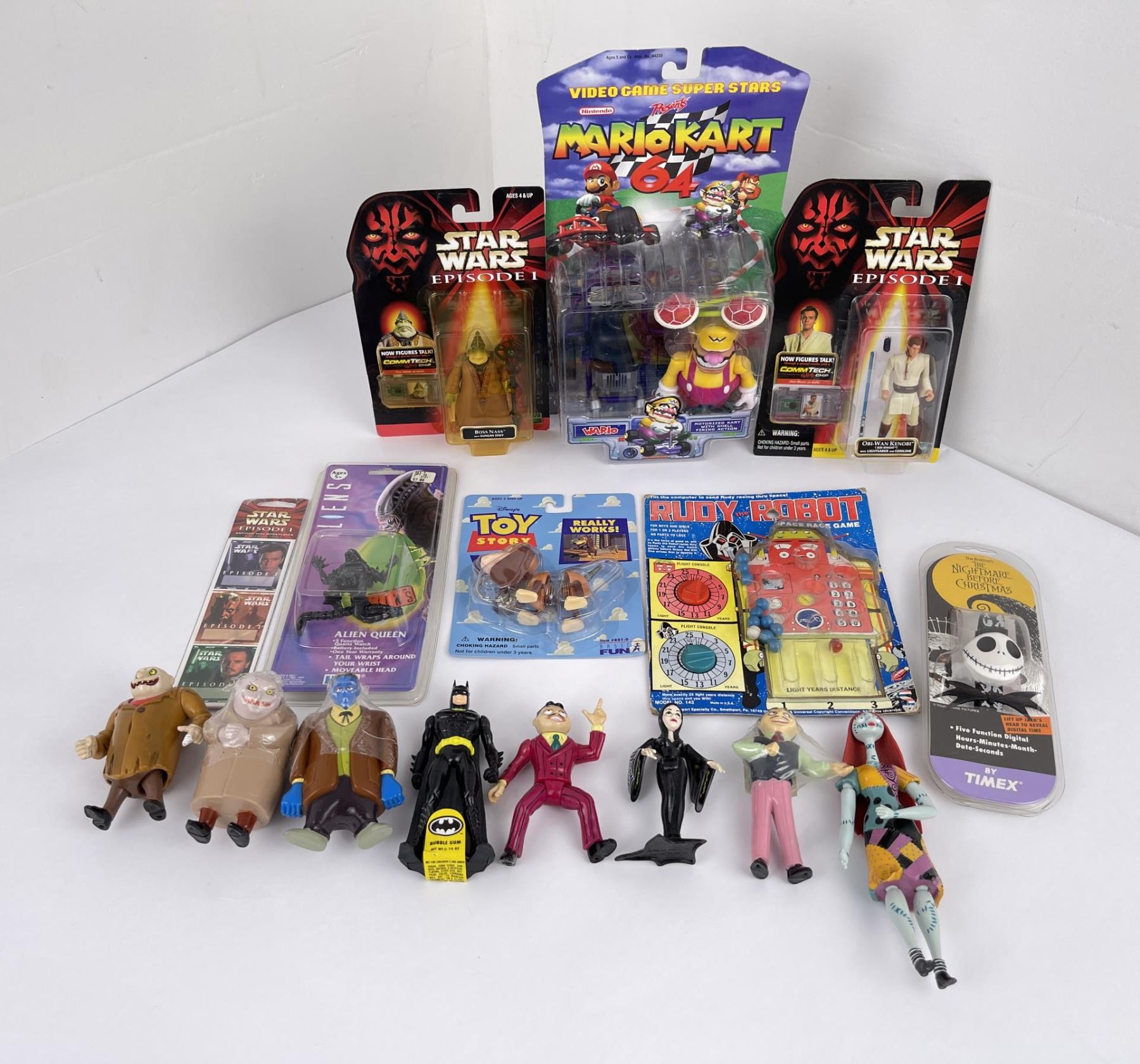 Very nice grouping. One Mario Kart Wario, mint on card. Nightmare Before Christmas Timex Watch, Toy Story Slinky Dog, and more.