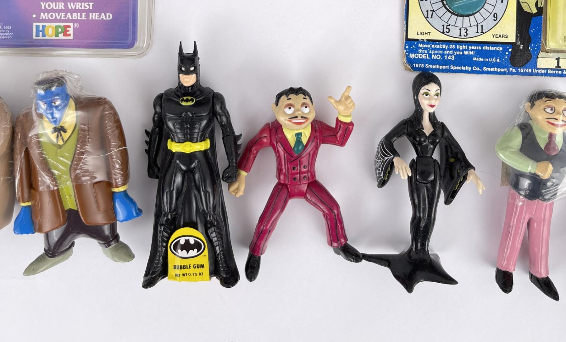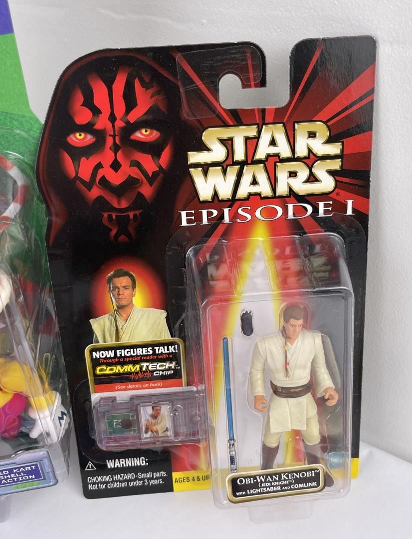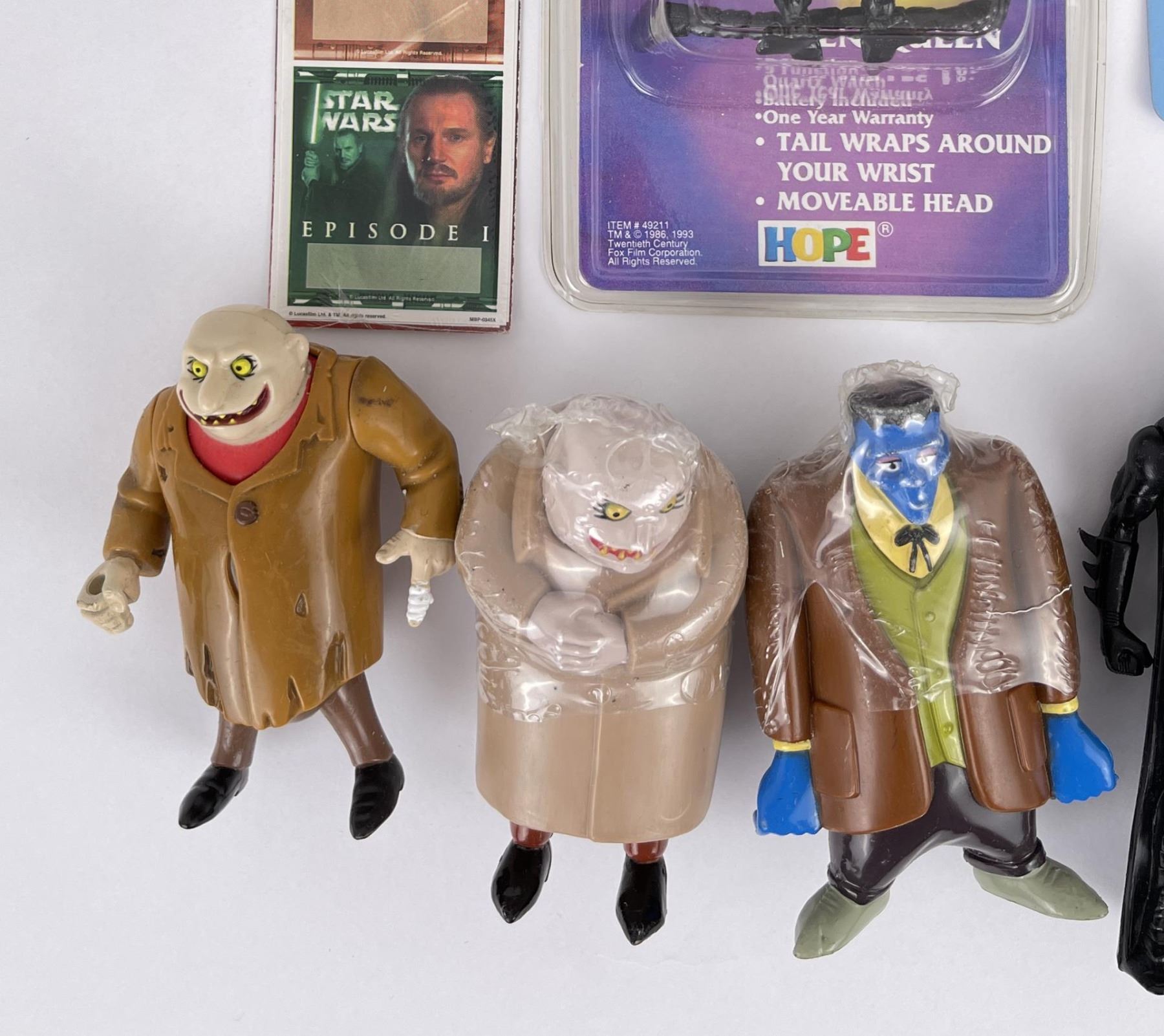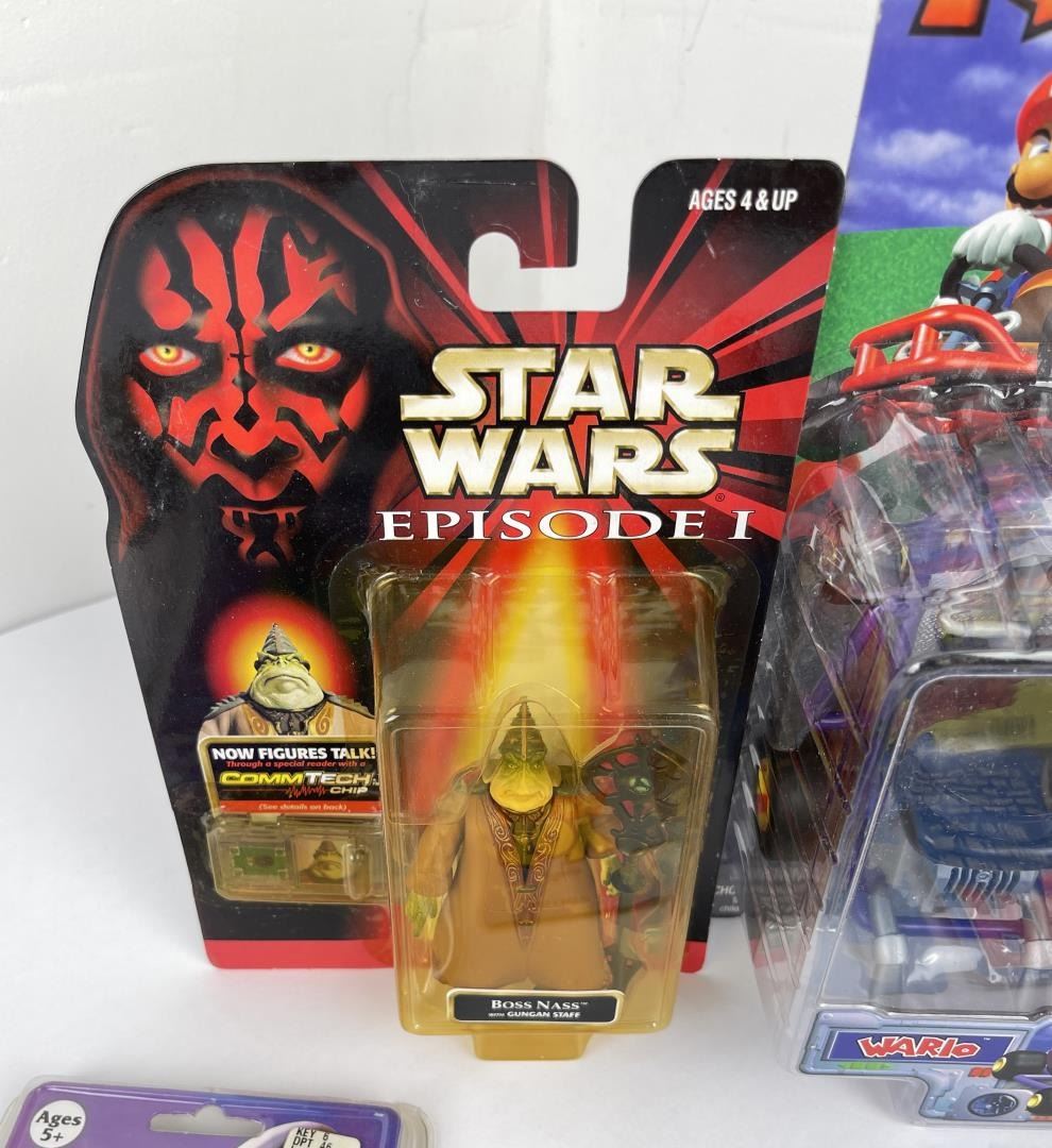 Very nice grouping. One Mario Kart Wario, mint on card. Nightmare Before Christmas Timex Watch, Toy Story Slinky Dog, and more.