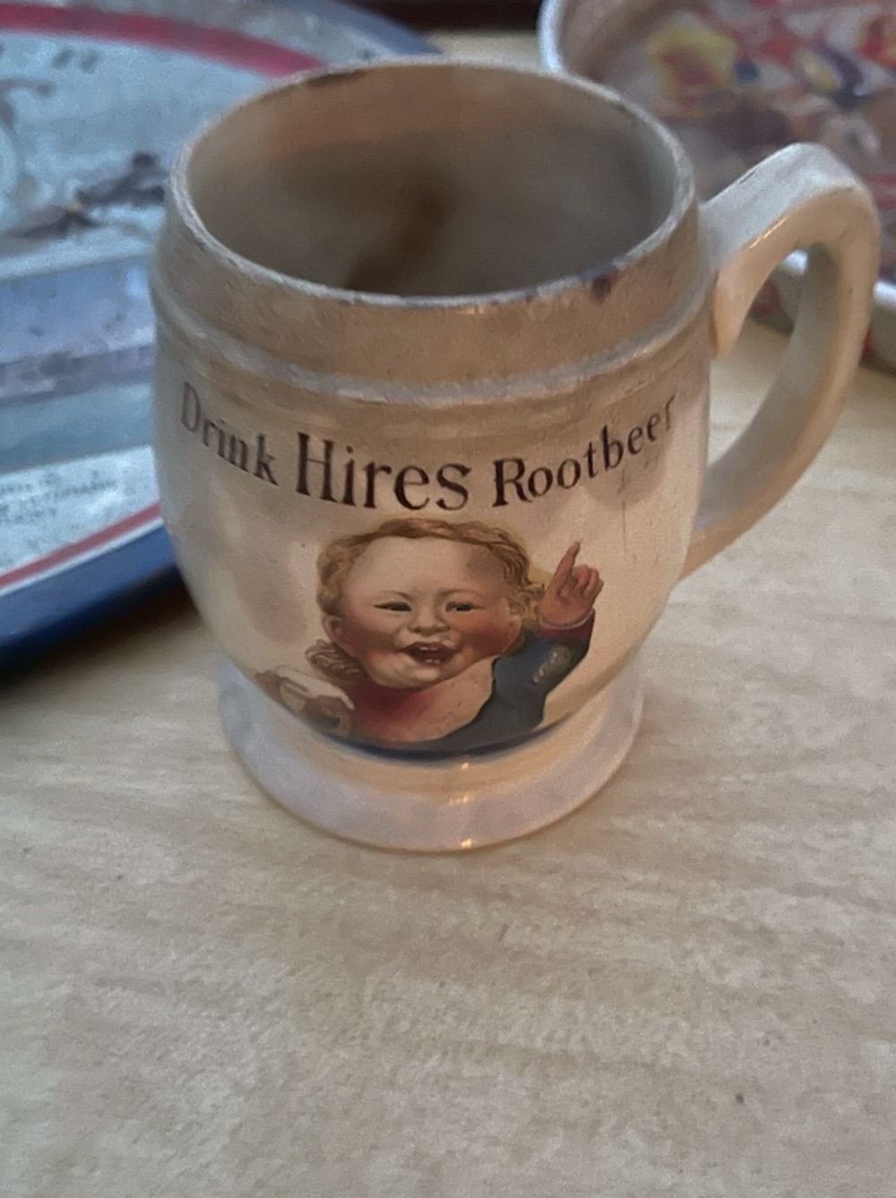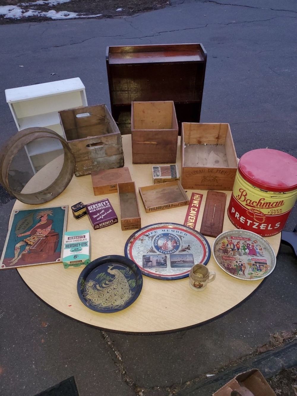 Collection of advertising country store items including, Drunk Hires Root Beer mug, advertising wooden crates, Hershey's chocolate cardboard candy boxes, Pretzel tin, Howe Caverns sign, cigar boxes, etc. approx. 19 items