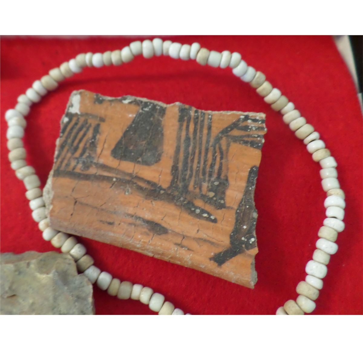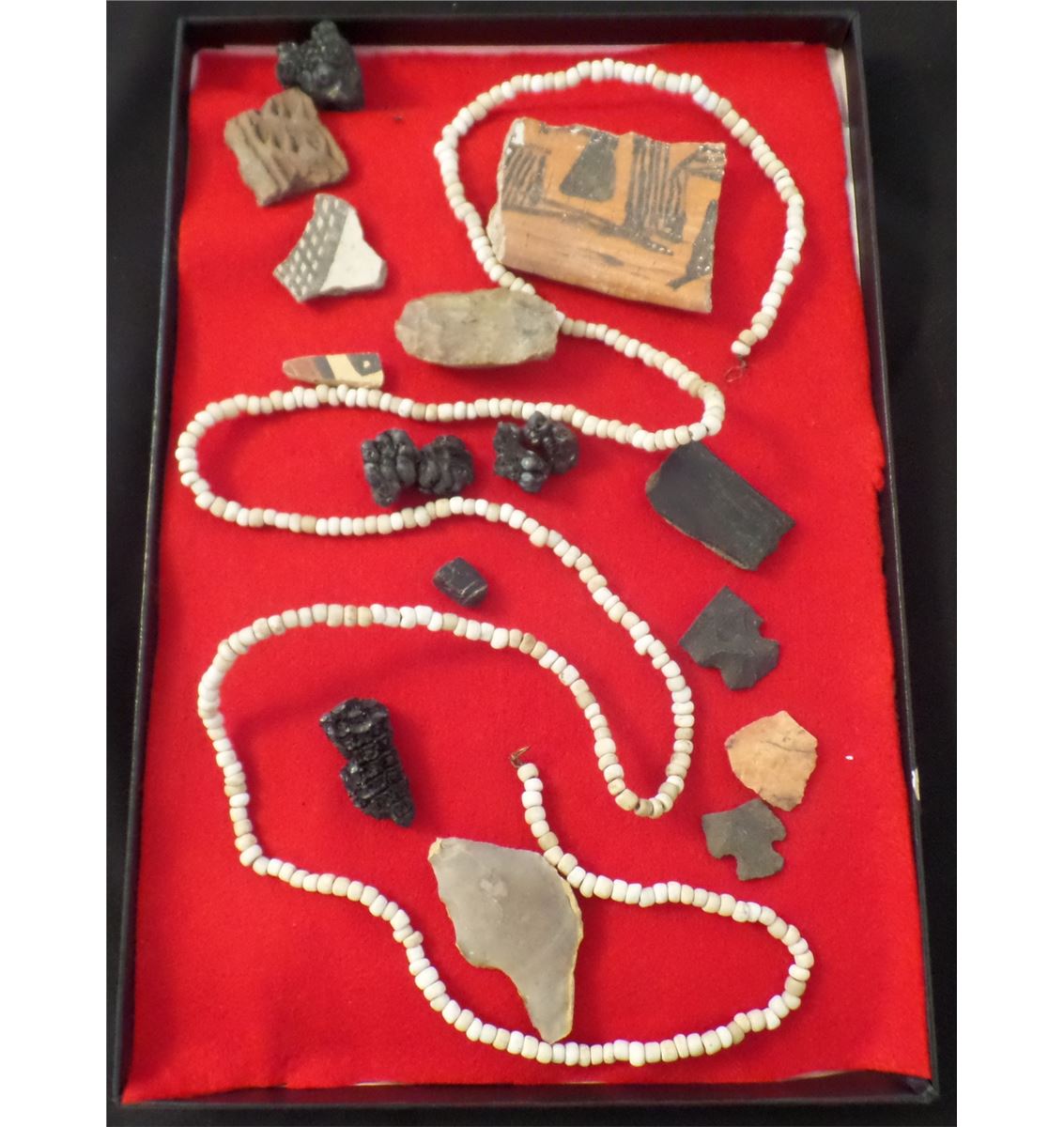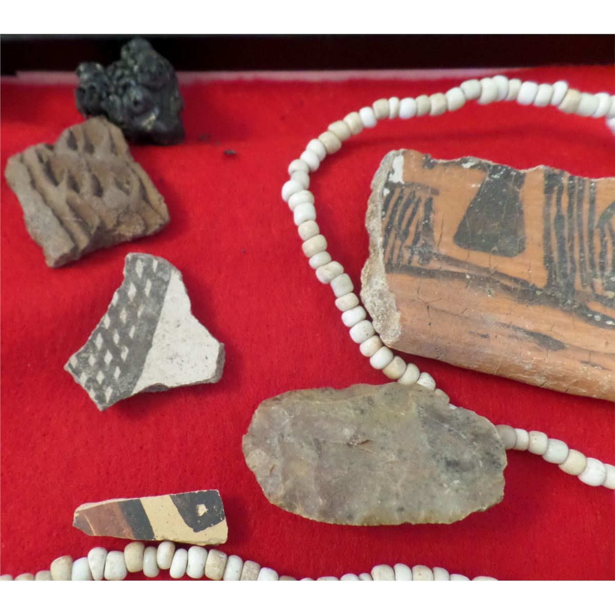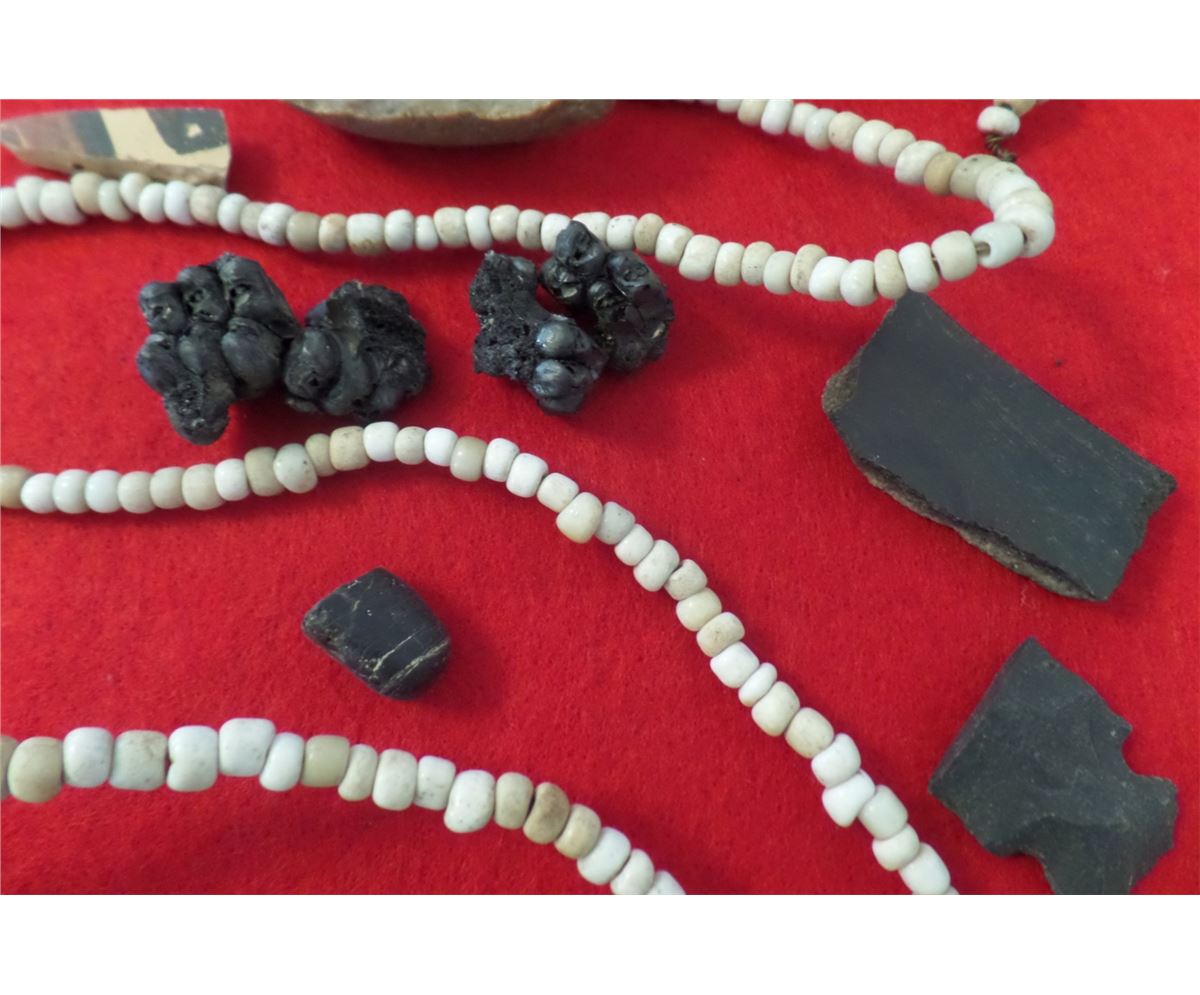 Collection of Anasazi Artifacts consisting of Hudson bay trade beads, broken pottery fragments. The item is from Four Corners Area. Frame is not included. As found condition. Shipping: 18.50
