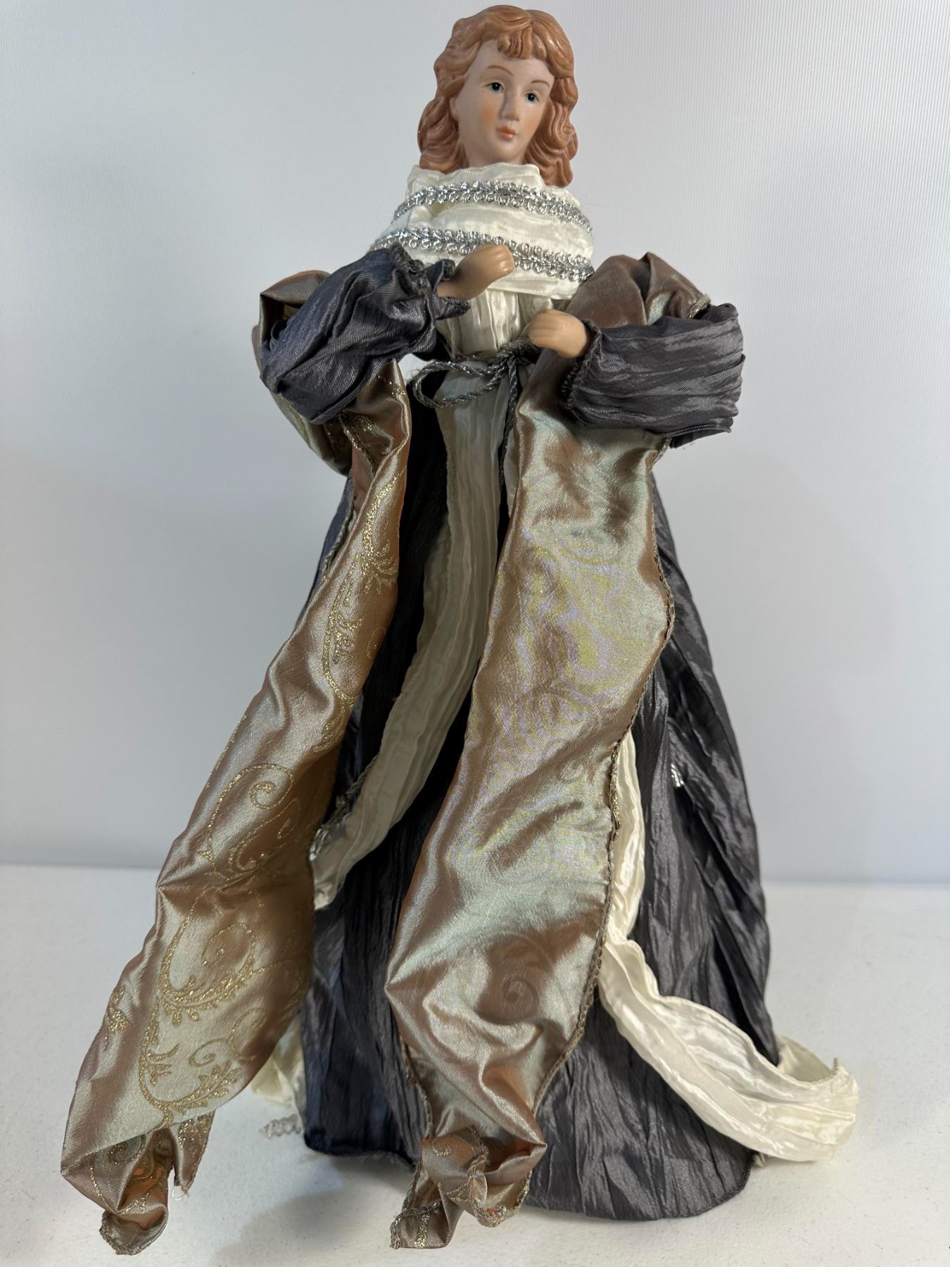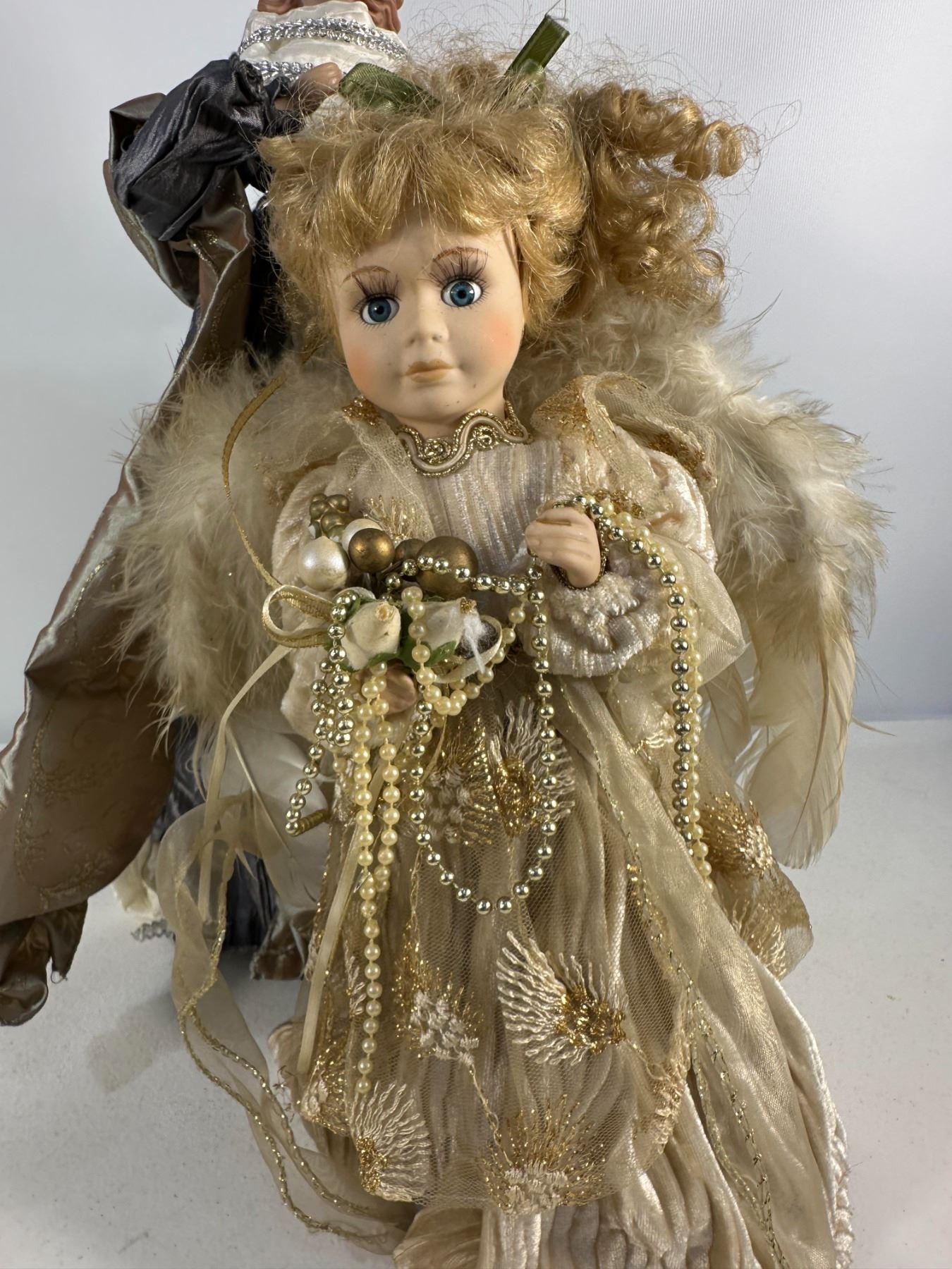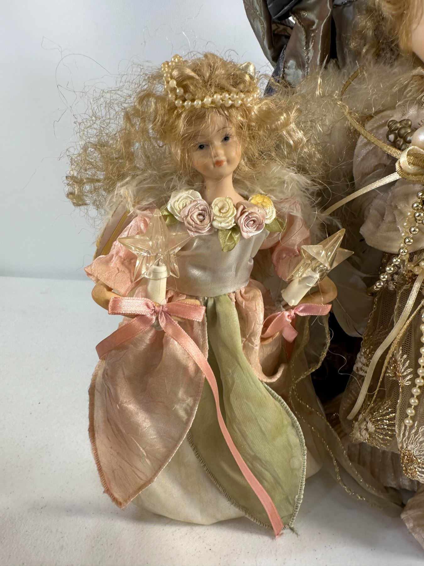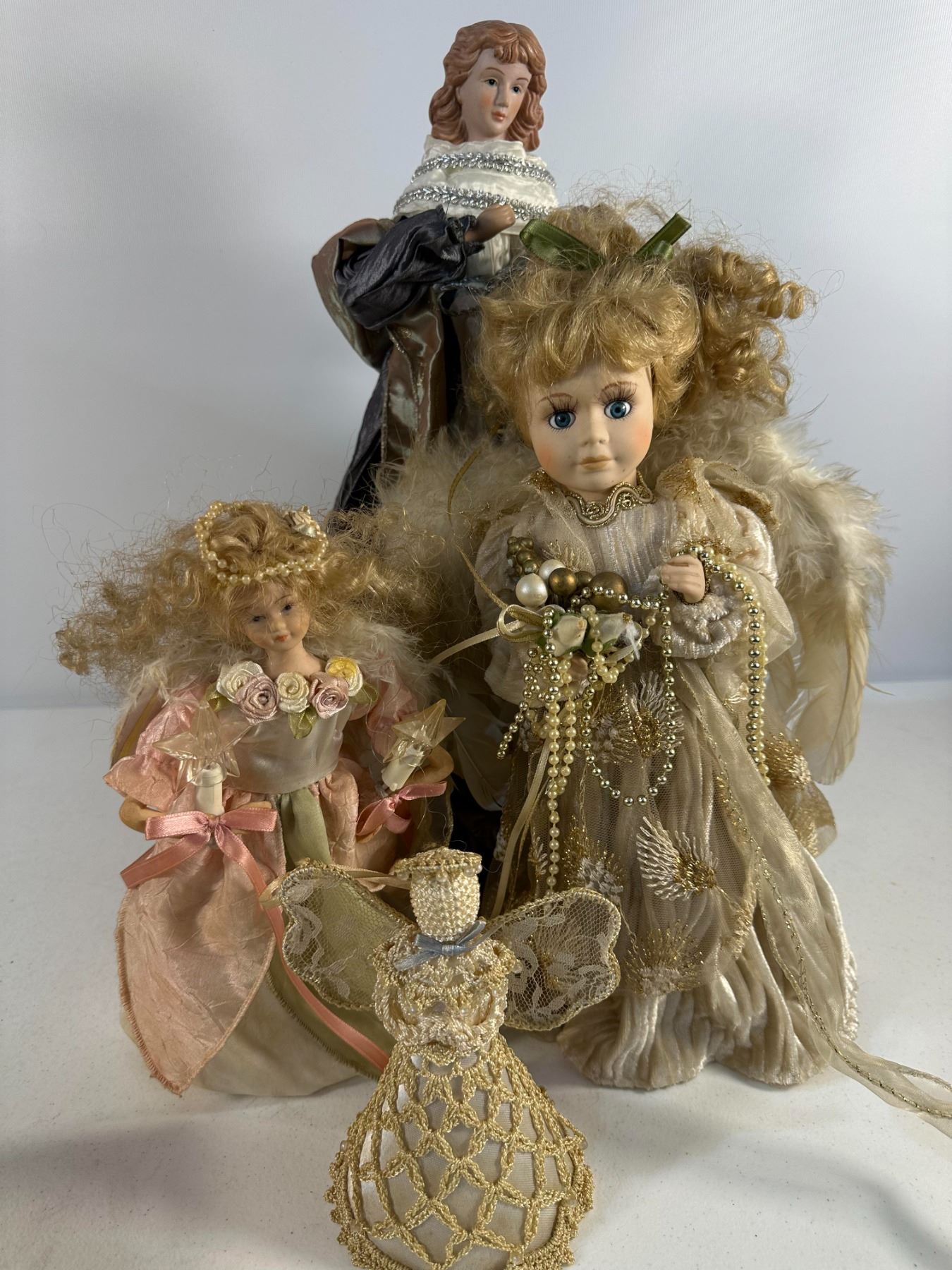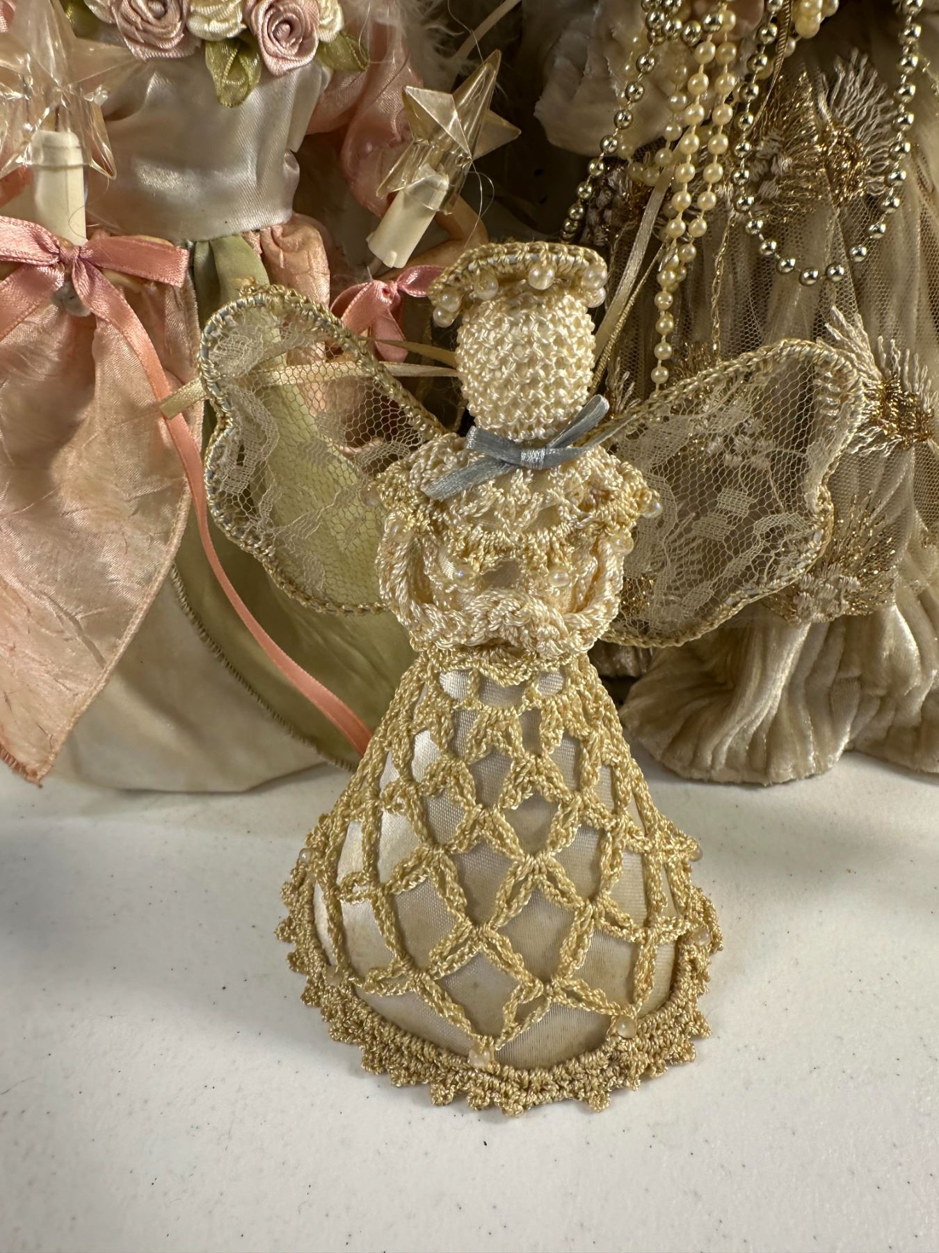 Four vintage-style angels with lace and satin gowns and feathered wings, plus a crocheted lace angel ornament. Good overall, some fabric wear.