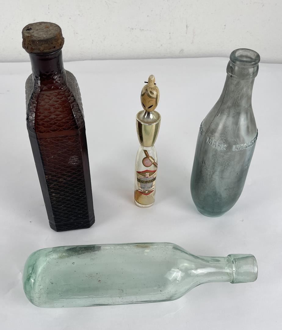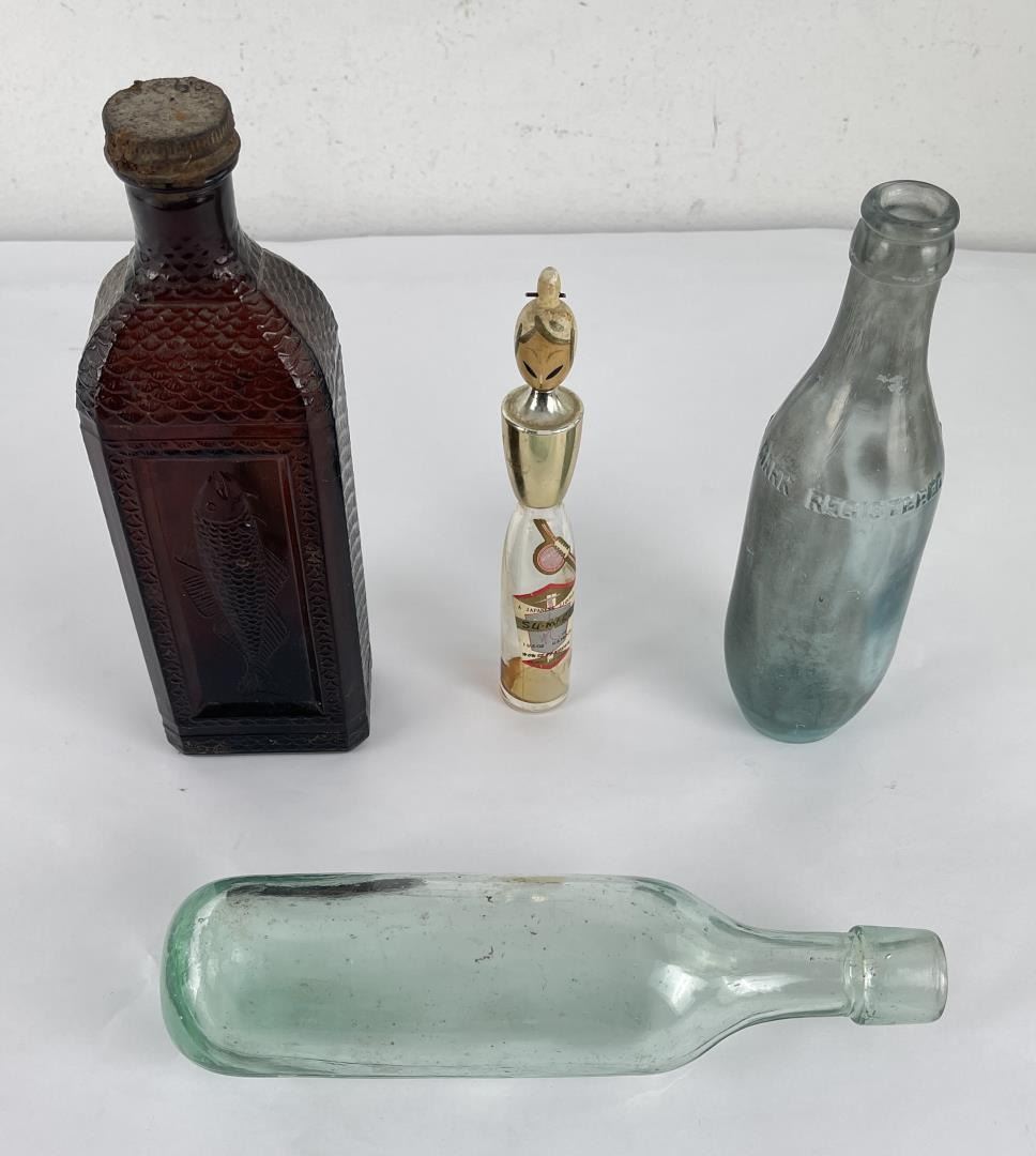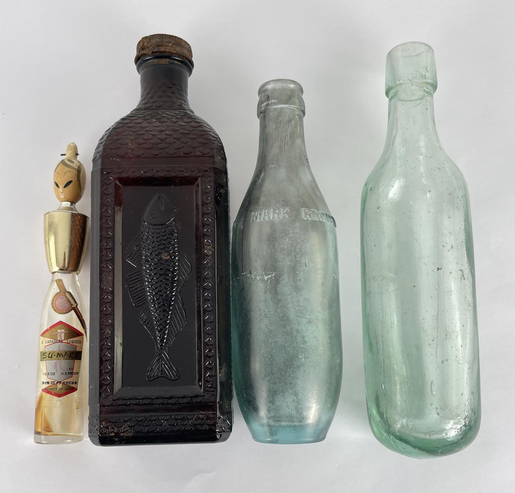 Hires Torpedo Bottle. Sumire Japanese Whiskey Bottle, Cod Liver Oil, and an Unmarked Torpedo bottle.