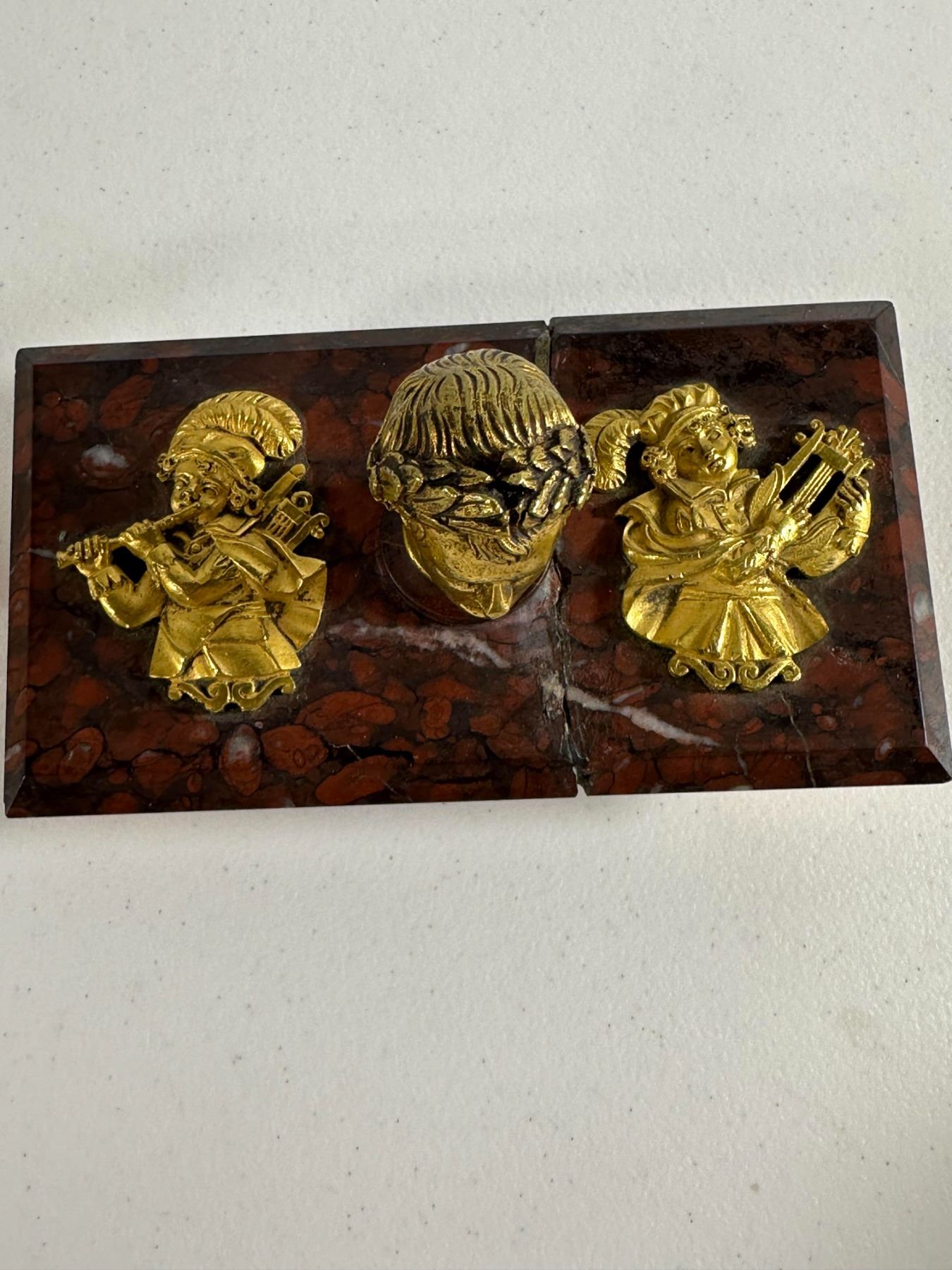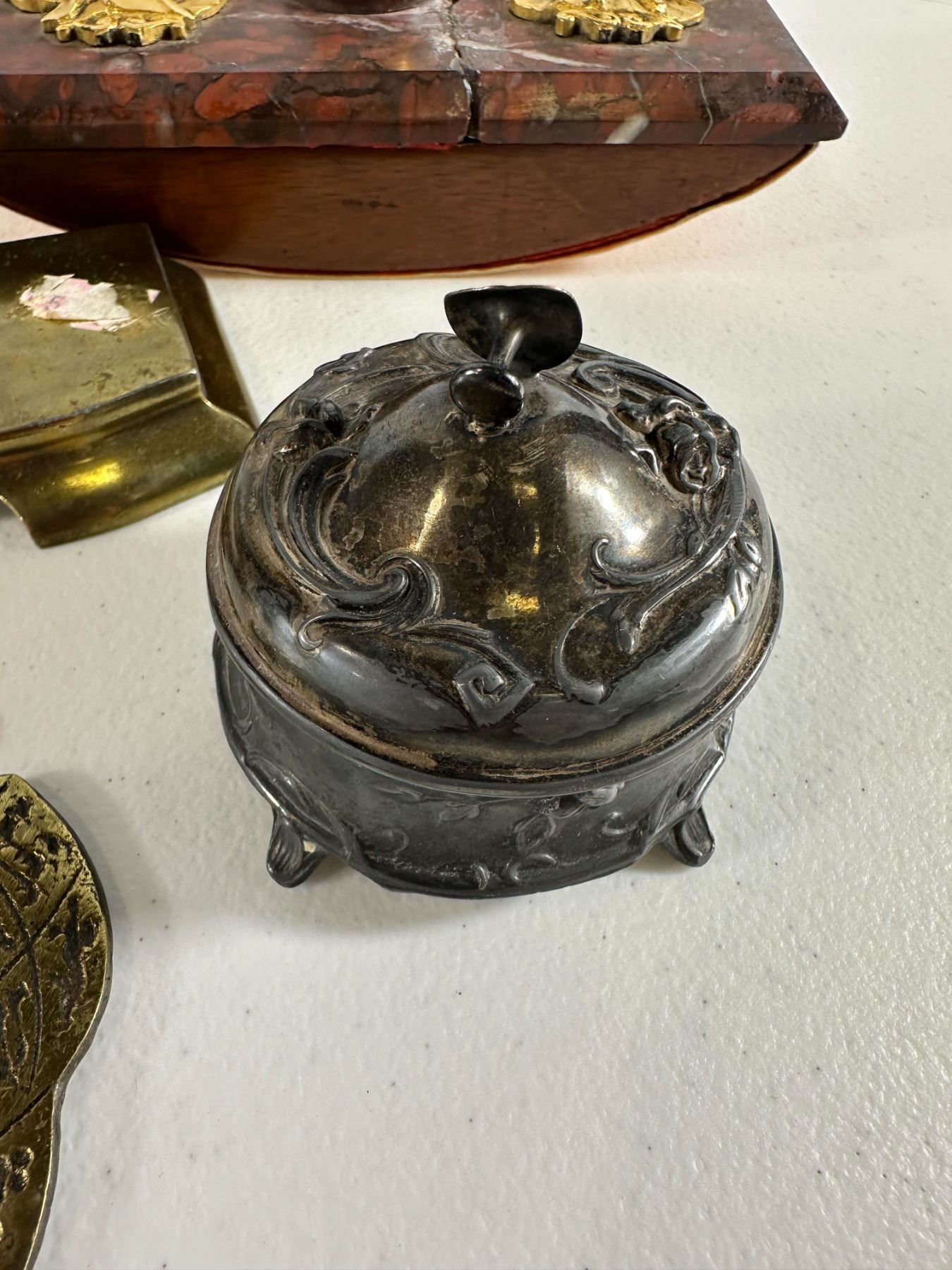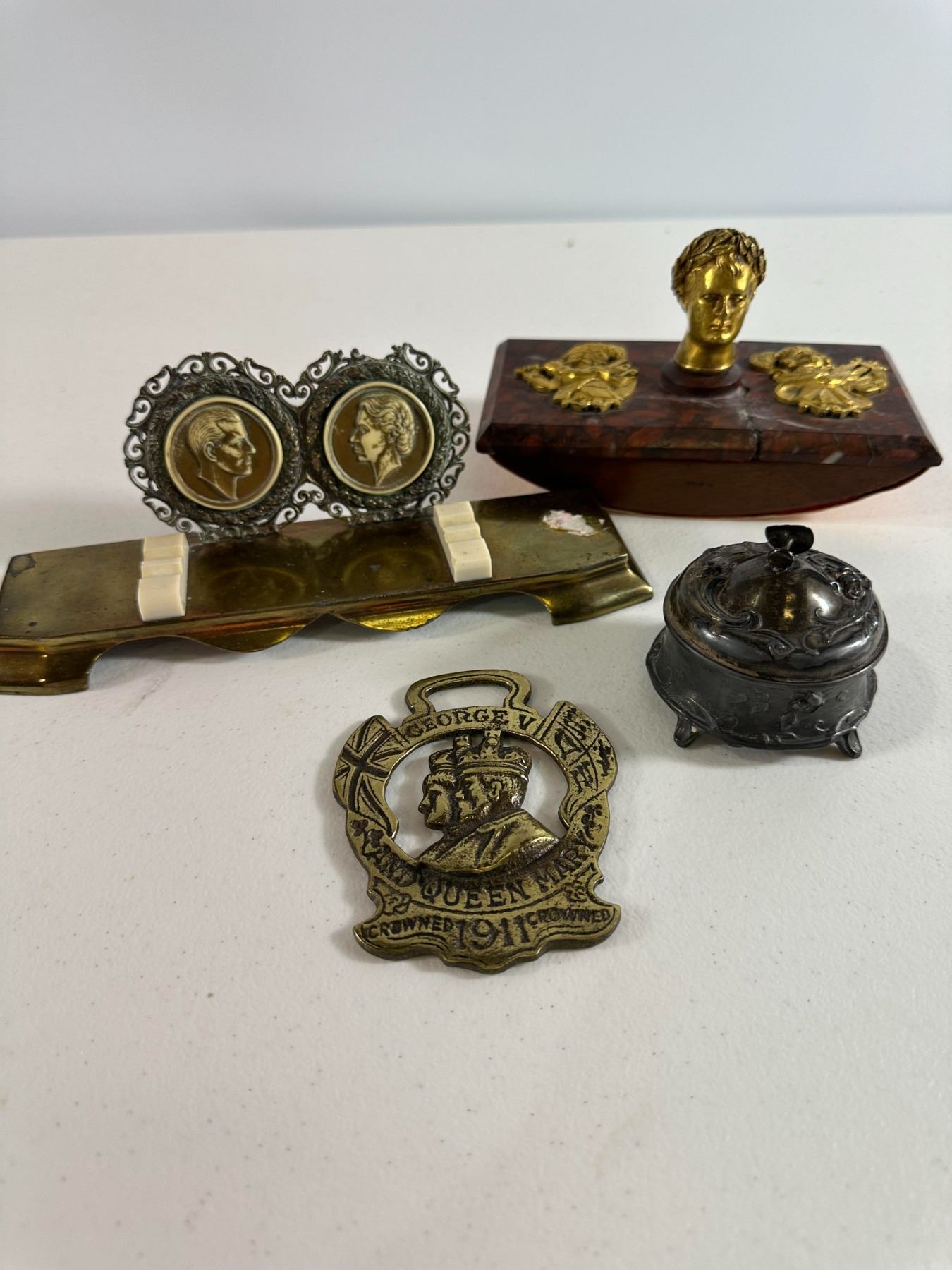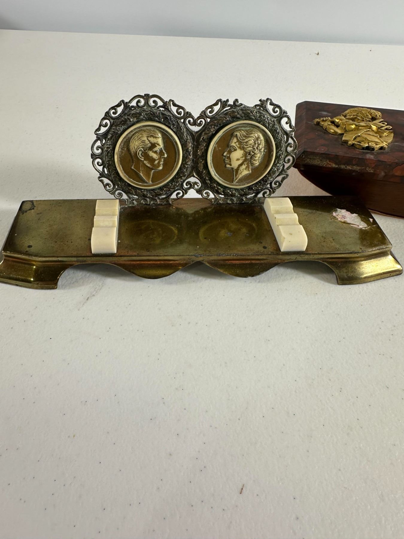 Bronze and marble desk blotter, framed portrait medallions of Queen Elizabeth II and Prince Philip, Brass commemorative badge for King George V and Queen Mary, 1911 Coronation, silverplate lidded trinket pot with decorative feet, Additional brass pen rest or desk piece