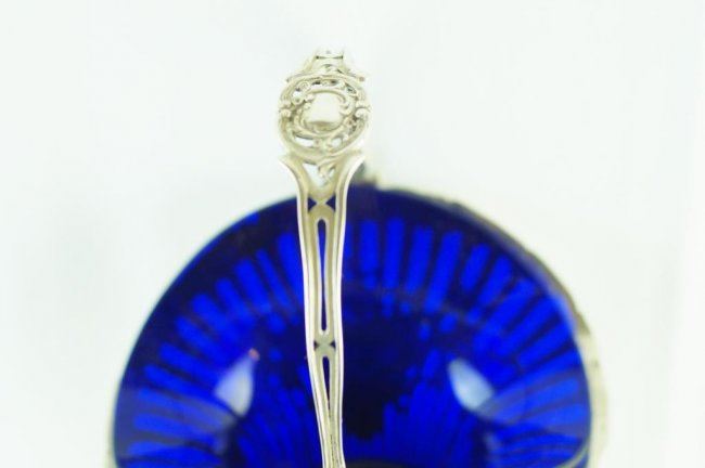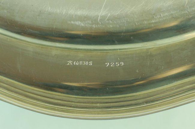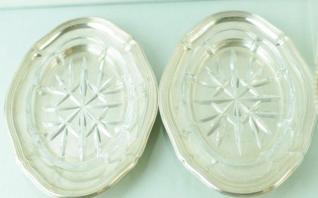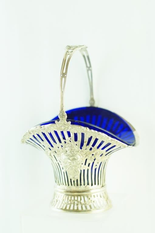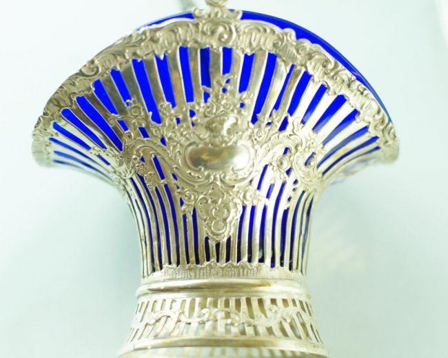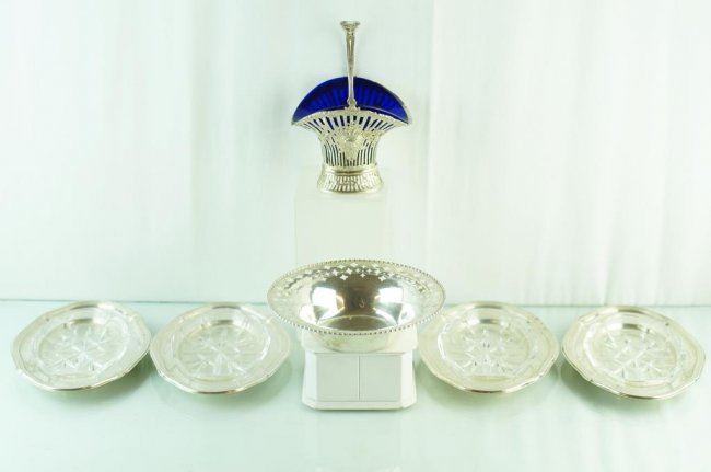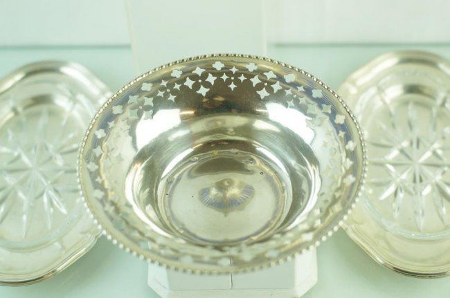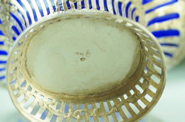 4 antique German 835 silver serving trays with glass insert. Shows makers mark. Fantastic early pierced 800 German silver basket with cobalt insert - German makers mark and a pierced sterling bowl