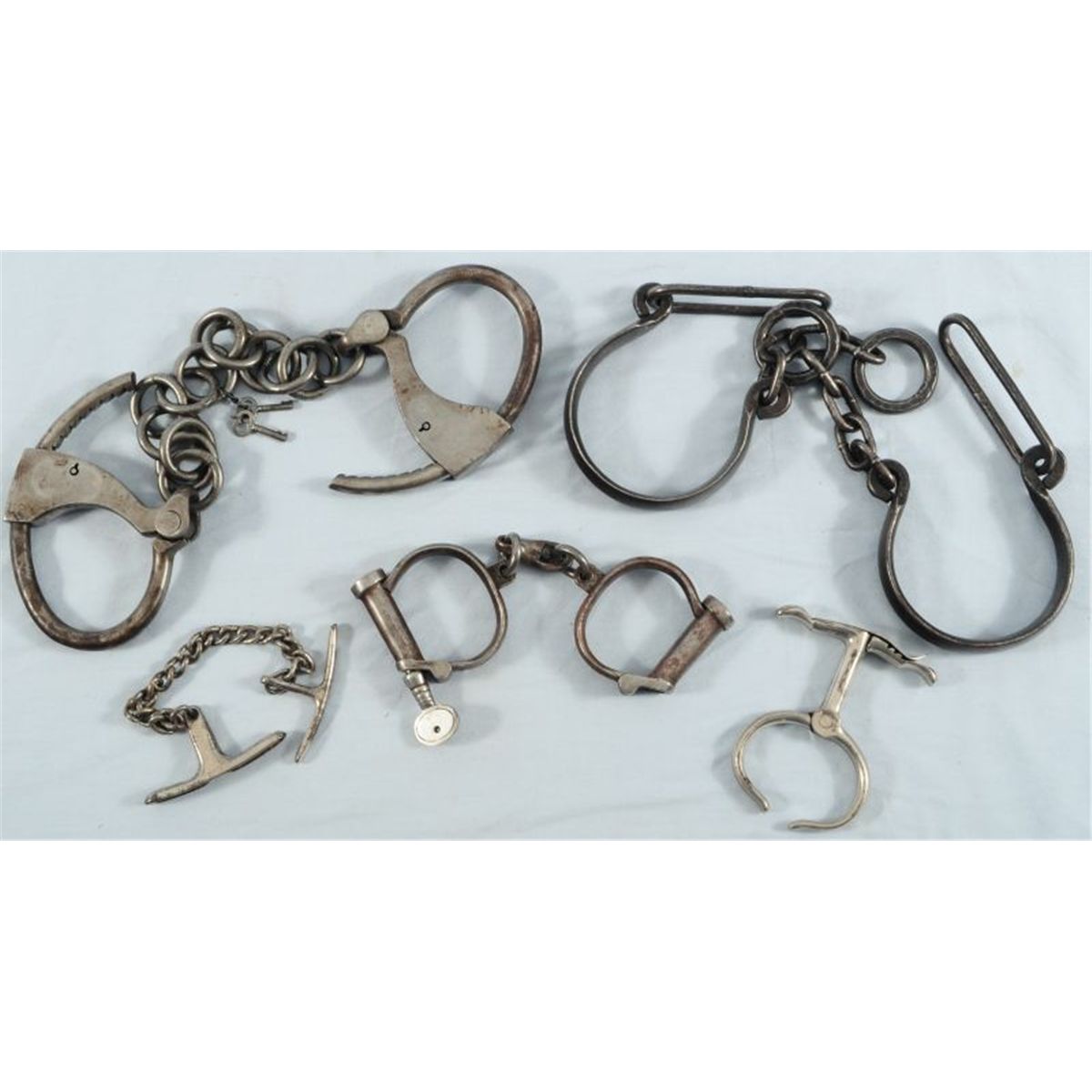 Collection of 5 Antique Restraint Systems. 2 Pairs of Hand Cuffs, 2 Come Alongs, 1 Pair of Shackles.
