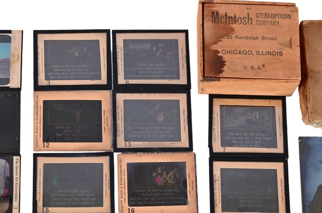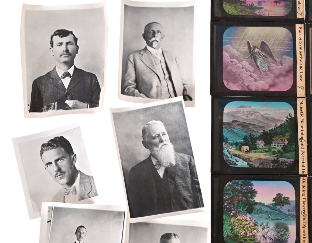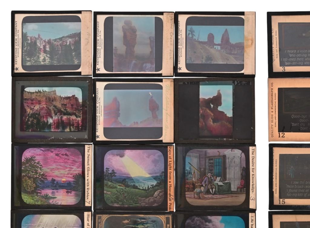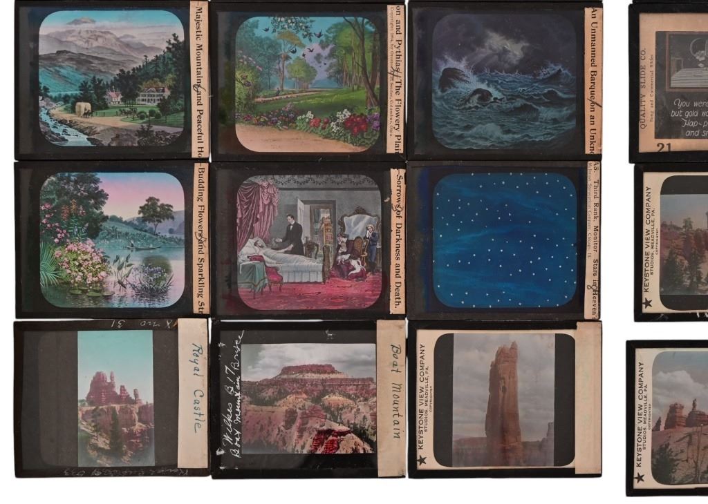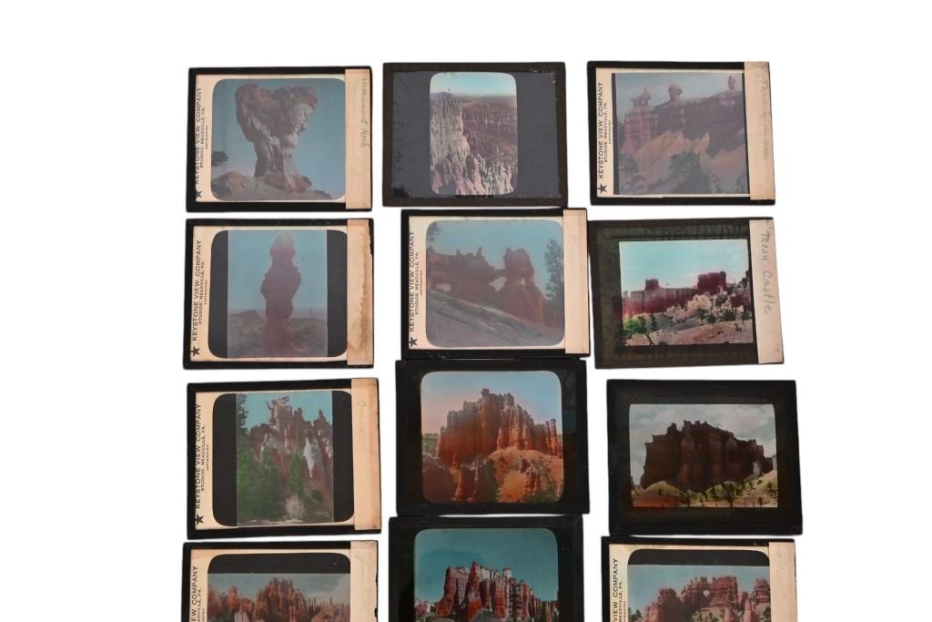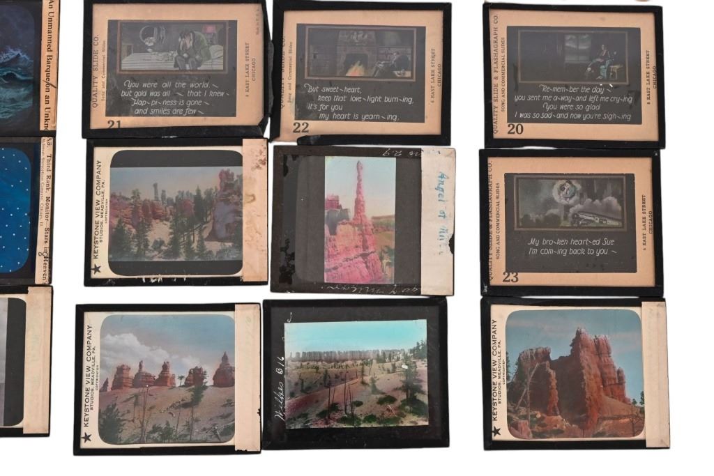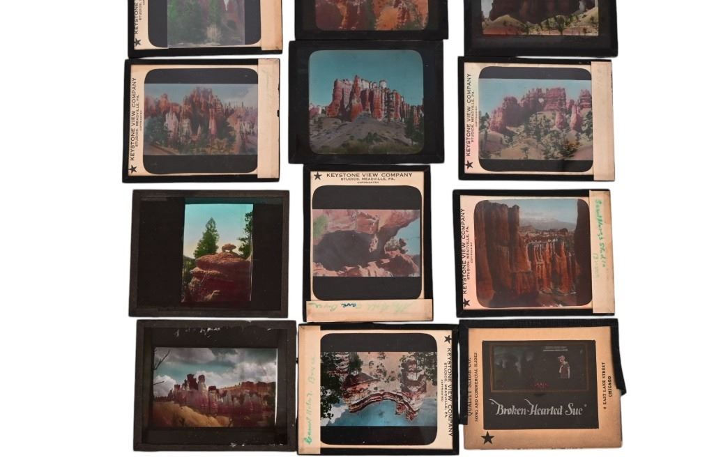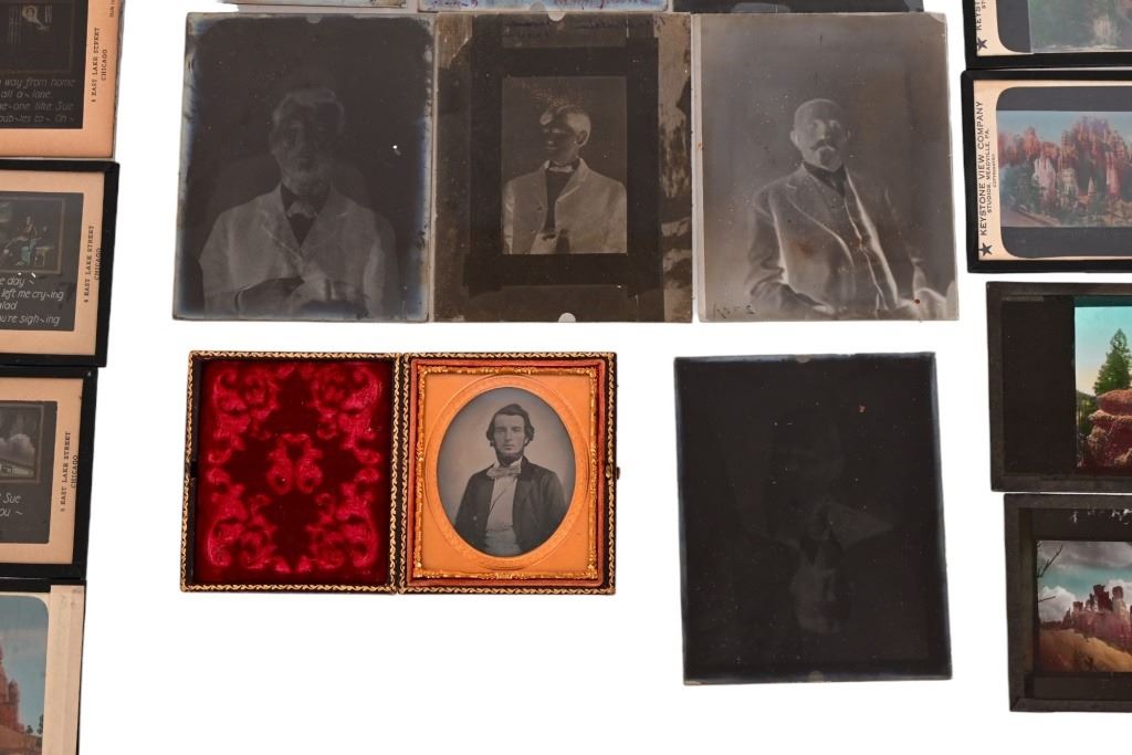 Magic lantern slides, mostly of very nice landscapes, Monument Valley by Keystone View Company, entertainment scenes from Quality Slide Co. Includes a collection of antique photos and glass negatives of well-dressed gentlemen, as well as a cased daguerreotype.