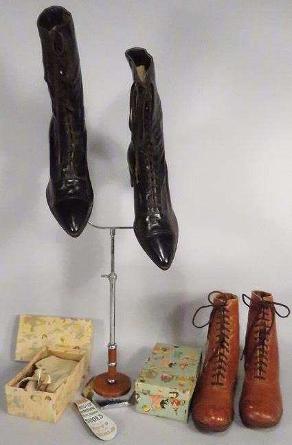 Collection of Antique/Vintage Shoe Items. Ladies black and brown boots. Shoe display with celluloid trimed base. Buster Brown tin litho shoe horn. Baby high top leather shoes in decorative box. Kinney Co. Inc childs shoes decorative box.