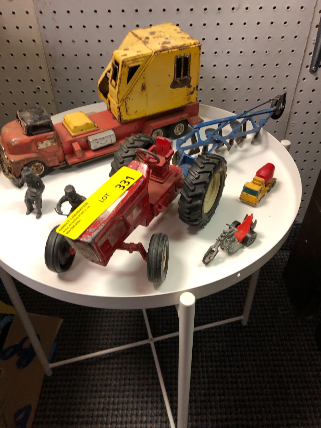 Collection of Antique Toys - Tractor and cast iron figurines plus table