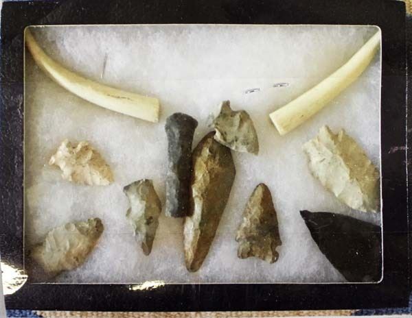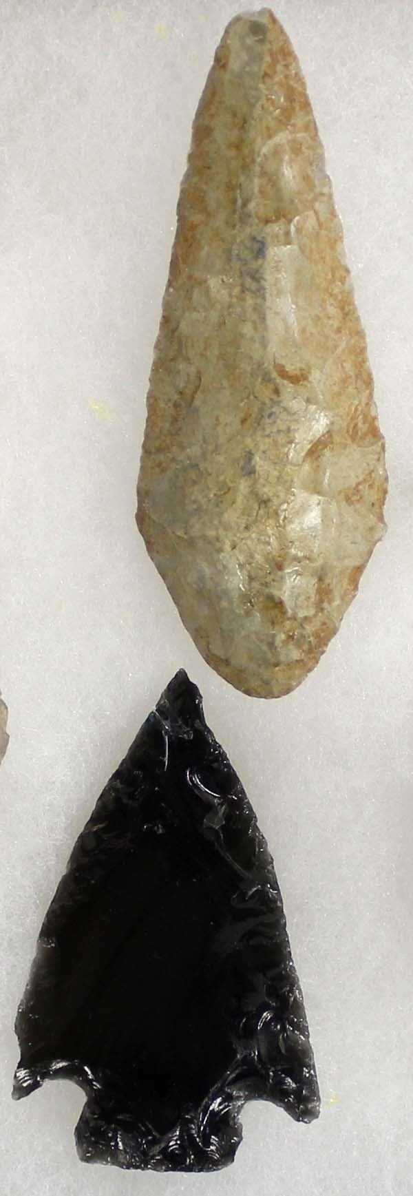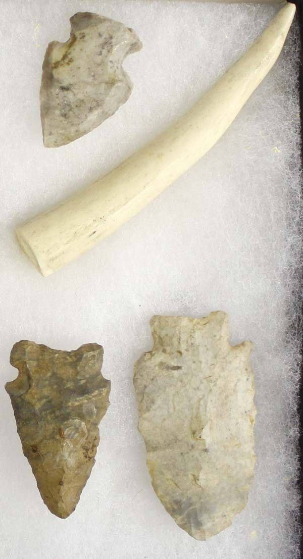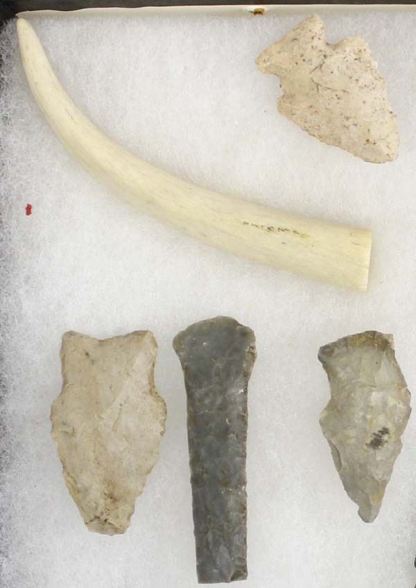Collection of Arrowheads and 2 Tusks, includes 6 Prehistoric Native American stone arrowheads and 1 stone drill (broken tip), 1 contemporary obsidian arrowhead, and 1 contemporary stone arrowhead, longest arrowhead measures 3''L, tusks measure 3.5''L