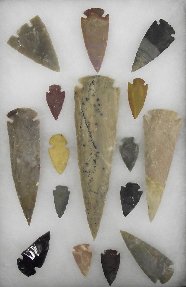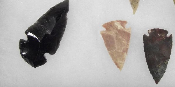 Collection of Arrowheads in Riker Box. Assorted sizes, longest 4.5'' and various stones including obsidian.