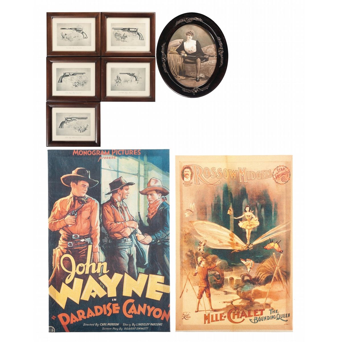 Hand colored image in the original oval mahogany frame with gesso floral appliqué that measures 22" x 25" and the lady has embroidered on her skirt pocket a heart & has a beckoning smile. Four Colt centennial prints (Paterson, Army, Navy, Walker and Wells Fargo revolvers), "Rossow Midgets" on canvas and "Paradise Canyon" on canvas.