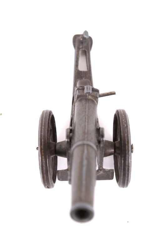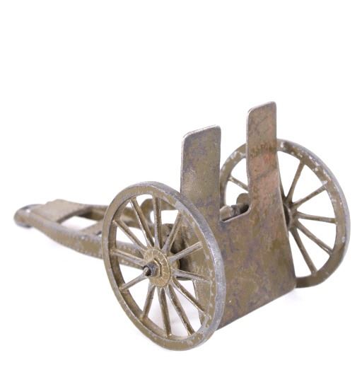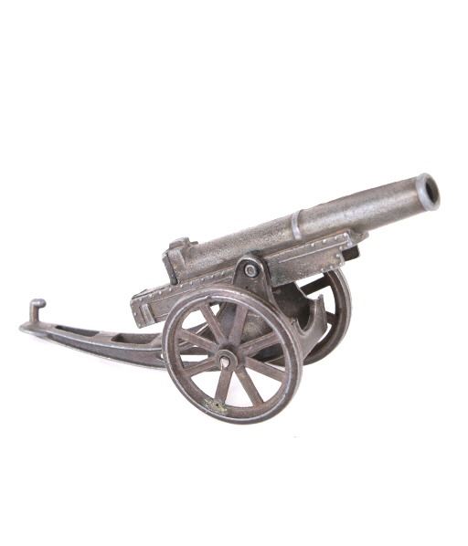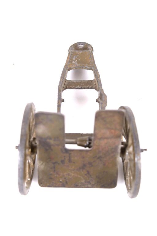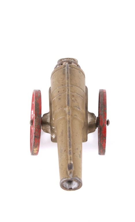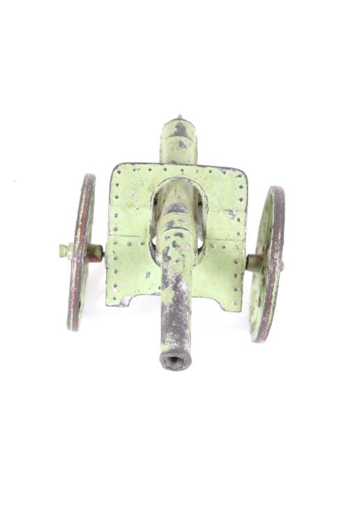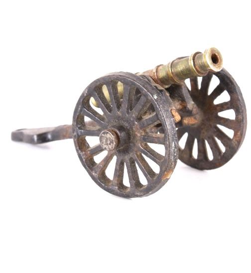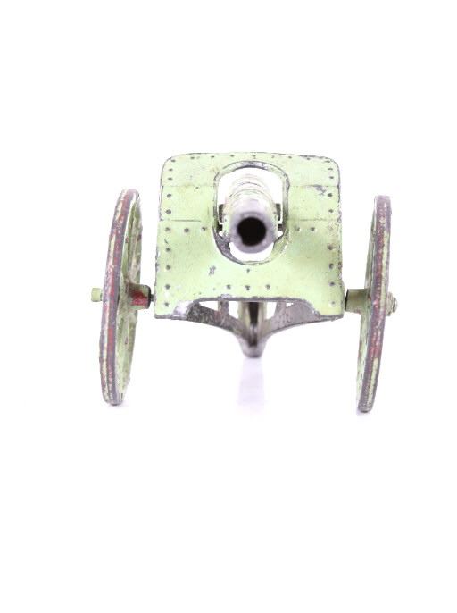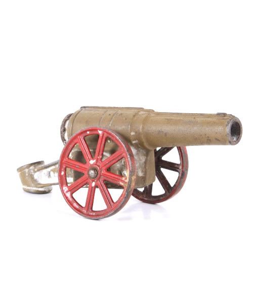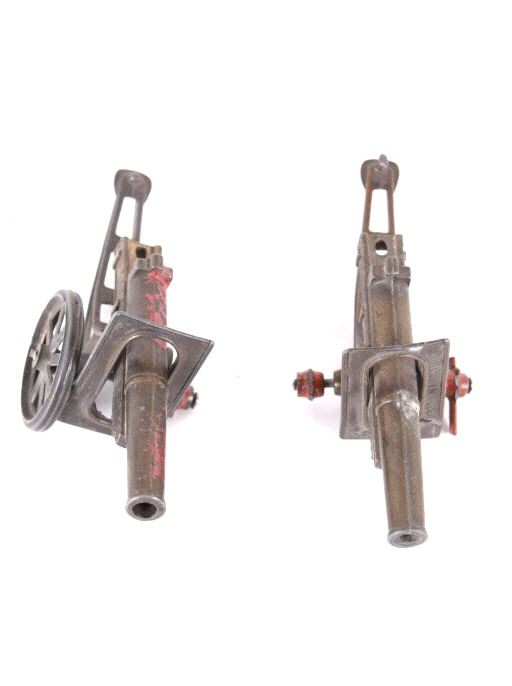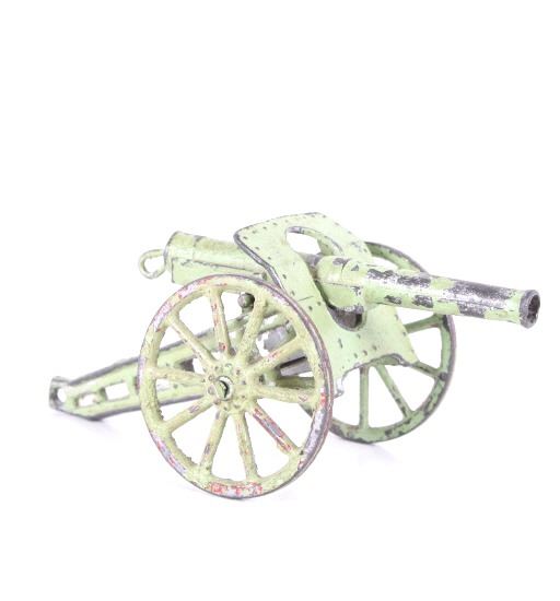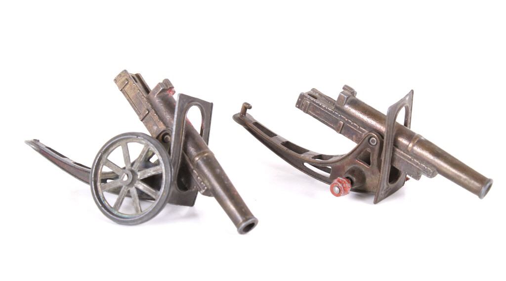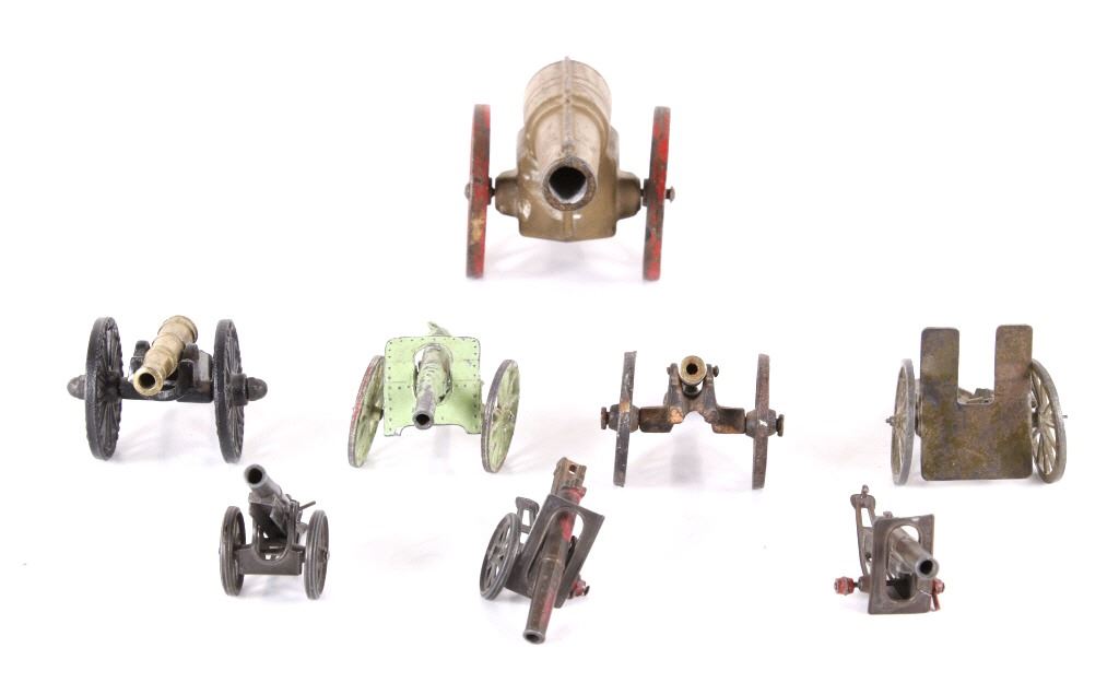 Available for your bidding pleasure we have a collection of assorted generations of cannon toys. This lot contains a variety of cannons and field guns from different eras. All the cannons seem to be made in the U.S.A. except one canon platform that is missing the gun barrel. The artillery guns range from 1800's battery cannons, to WWI era Field Batteries complete with ballistic plates and hitched bases for maneuvering around the battlefield. Three of the artillery guns were manufactured by Tootsie Toy and the others have makers marks that are unrecognizable. The measurements of these artillery toys range from 4" x 3 1/2" x 9" to 2 1/4" x 1 1/2" x 4".