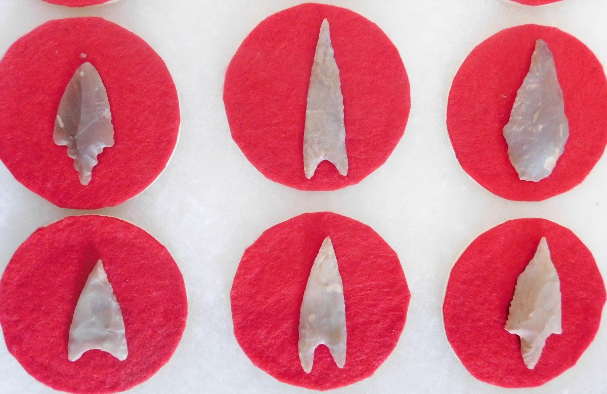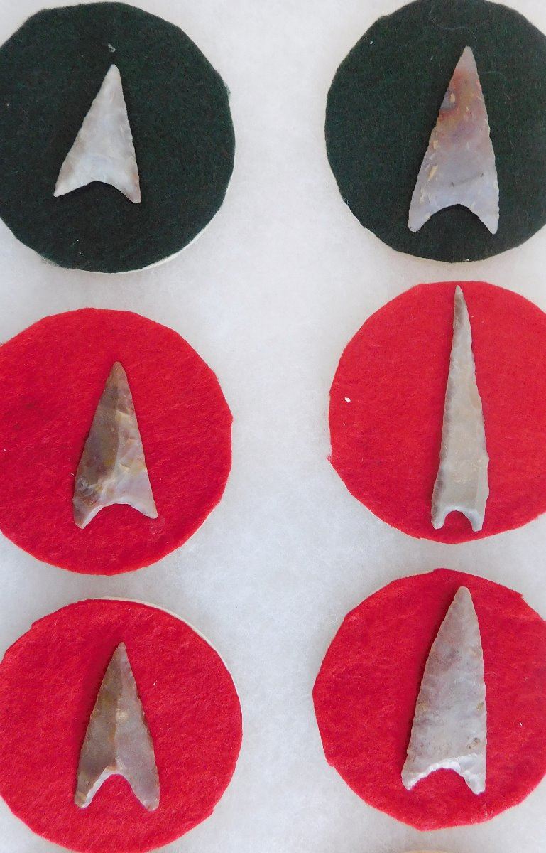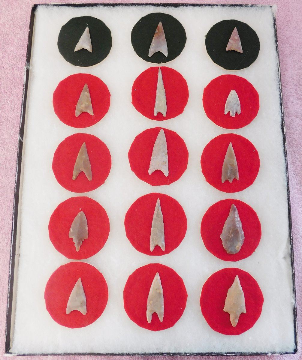 Collection of Authentic African Points, circa 5000 years old. Made of flint, the items measure from 1" to 2". Found in the Sahara desert. These are fine items, chosen from thousands of found points. Frame not included. Condition: As found, see images. Shipping: $20.00 w/insurance and signature.