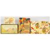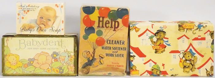 Collection of Baby Items. "Help" cleaner water softner and work saver, Baby's Own Soap, Babydent tin box, Brush and comb set in decorated box.