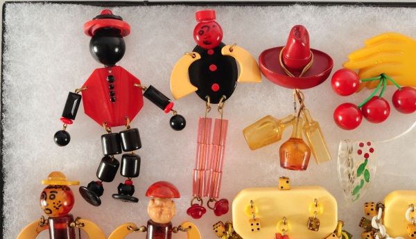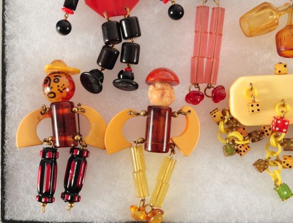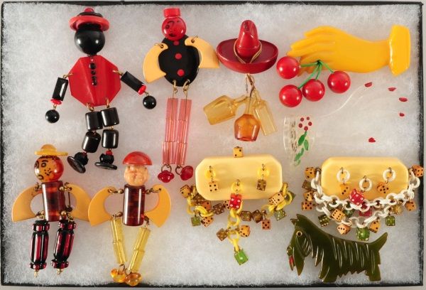 Vintage bakelite pins, 4 figures, 2 hands, 2 gambling/dice brooch pins, a green scotty dog, & a sombrero with whiskey & tequilla bottle bakelite charms. Nice vintage collection In ryker case.