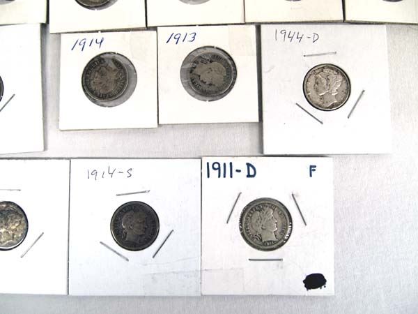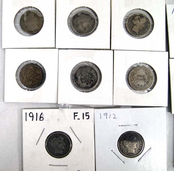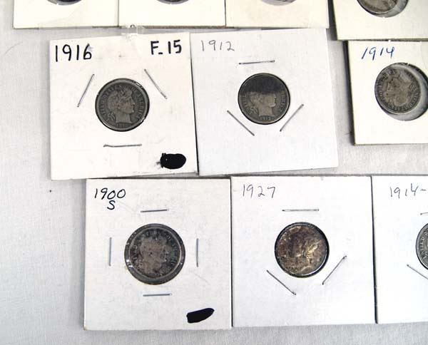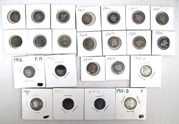 Collection of Barber Dimes, Mixed Dates & Mint Marks, Group 1: 1897, Two 1898, Three 1899 Group 2: 1900S Group 3: 1927 and 1944D Group 4: 1900, 1901, 1904, 1905S, 1907S, 1908, 1910D, 1912D, 1913, 1914 Group 5: 1911D, 1912, 1914S, 1916