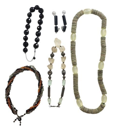 Collection of beaded jewelry including four necklaces and one pair of earrings.