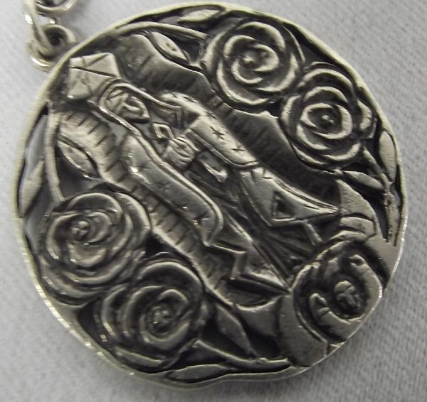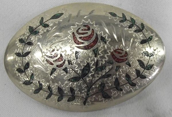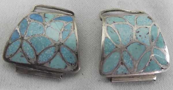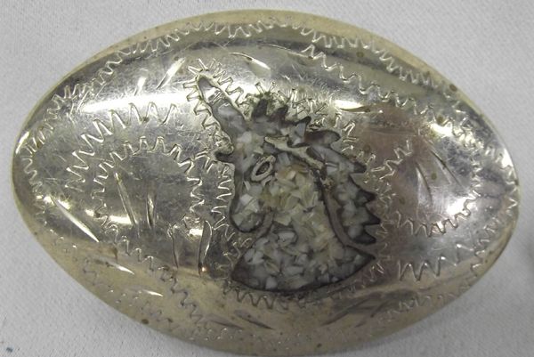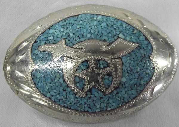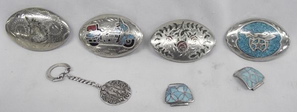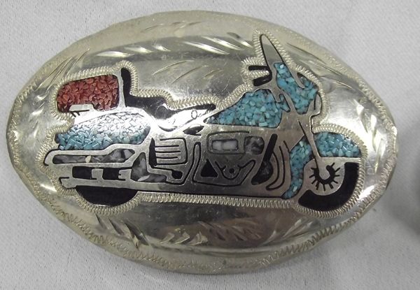 Collection of Belt Buckles, Watch Tips, & Keychain, #1 German Silver Chip Inlay Rose Belt Buckle hallmarked CB #2 German Silver Chip Inlay Unicorn Belt Buckle hallmarked CB #3 German Silver Chip Inlay Shriner's Belt Buckle hallmarked CB #4 German Silver Chip Inlay Motorcycle Belt Buckle hallmarked CB, all buckles measure 3''L x 2''W #5 Vintage Zuni Turquoise Inlay Watch Tips, one side needs to be resoldered, measure 1''W #6 Catholic Sterling Key Chain stamped Sterling