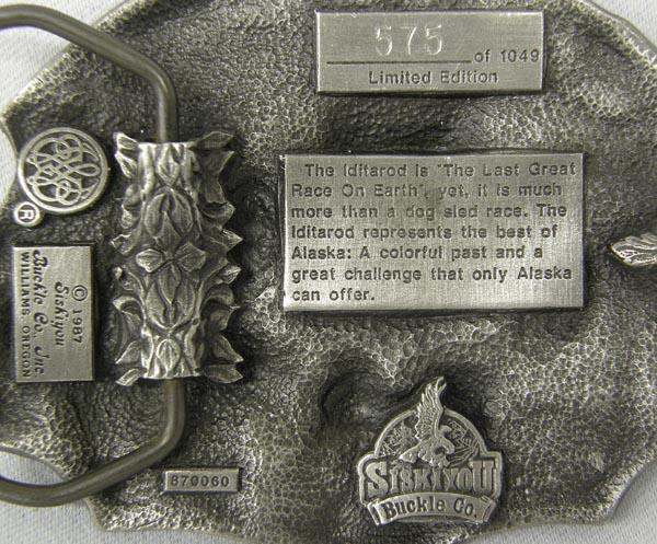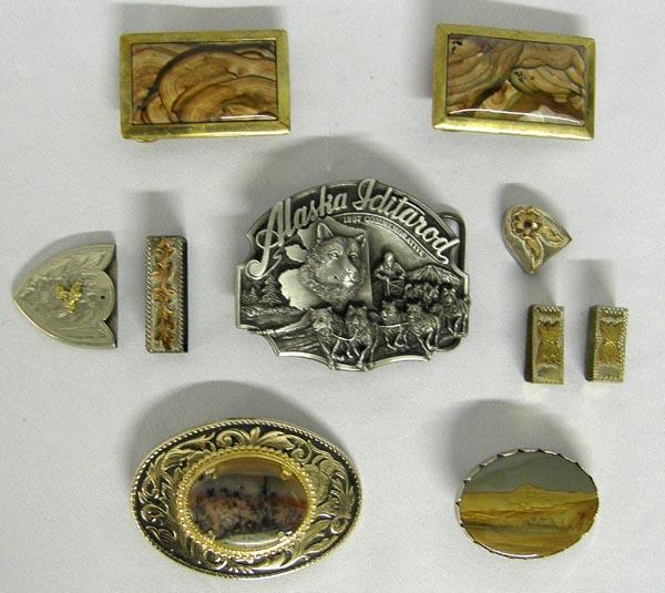 Collection of Belt Buckles and Ranger Belt Tips. The Iditarod buckle measures approx. 3.25''Lx3''W, 1 belt tip would accommodate a 1.5''belt and the other .75'' belt. Buyers Pay Actual Shipping and Handling Charges(see terms and conditions for more information).