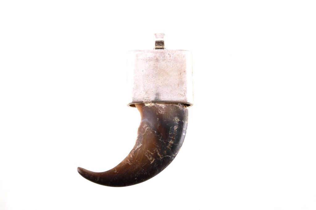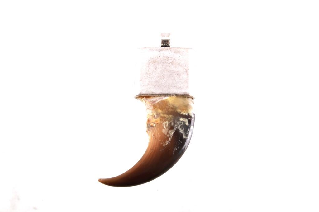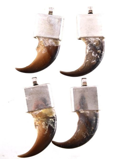 Featured in this lot are four black bear front claws topped with a metal cap for a necklace to be strung through. The claws have been dried and have had all fur removed, leaving a clean black bear claw. The claws are in good condition with slight signs of wear from use or preperation. The claws measure from the base of the cap 1 1/4" being the largest and 1" being the smallest. The over all measurements are 2 1/4" L x 1 1/4" W.