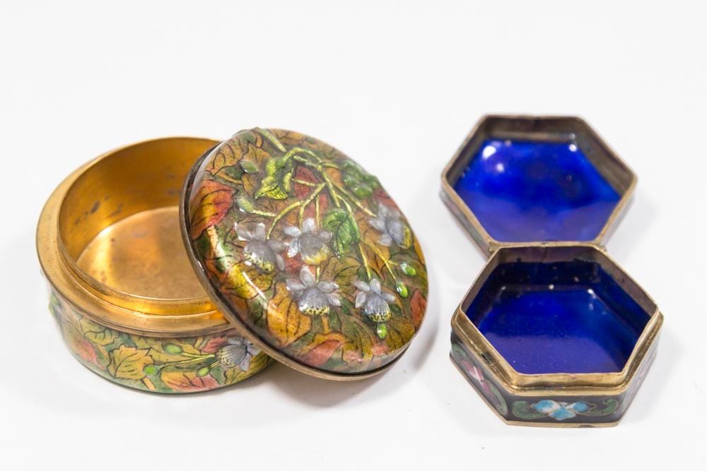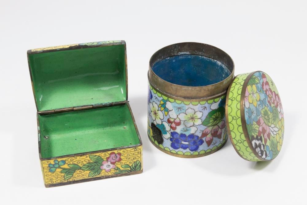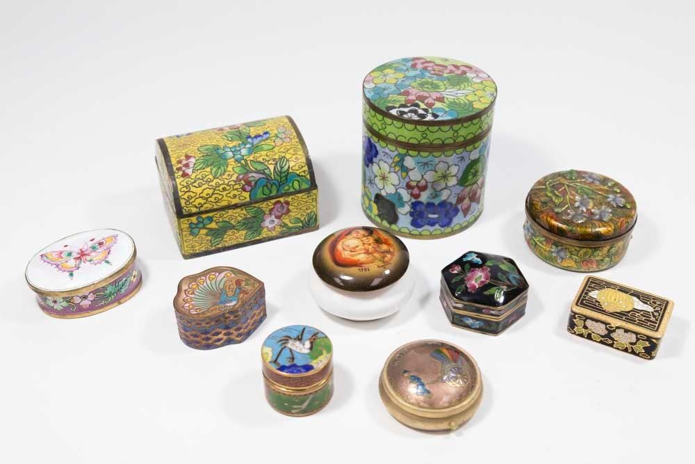 Including beautiful French enameled covered jar, cloisonné, and various porcelain. Various sizes. 10 pieces.