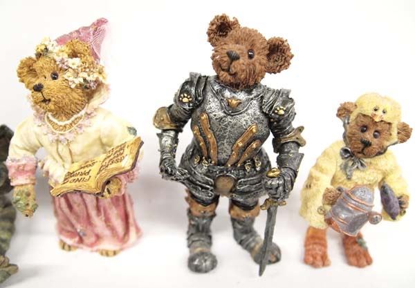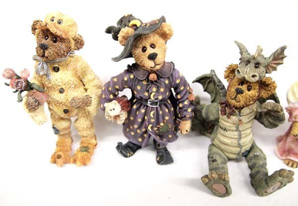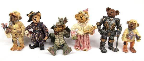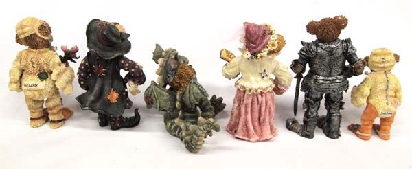 Collection of Boyd's Shoe Box Bears, #1 Izurs Draggon...Breathe Deeply #3228 #2 Sir Once a Frogh...Hop Nightly #3229 #3 Webster Grizberg...Just Duckie #3219 #4 Chicklet Grizberg...A Sprinkle in Time #3220 #5 Princess Aneeda Knight...Kiss and Tell #3227, #6 Hazel Spooksbeary #3225, largest measures 4.875'', all come in original boxes, one of the boxes has water damage, all figurines are in like new condition