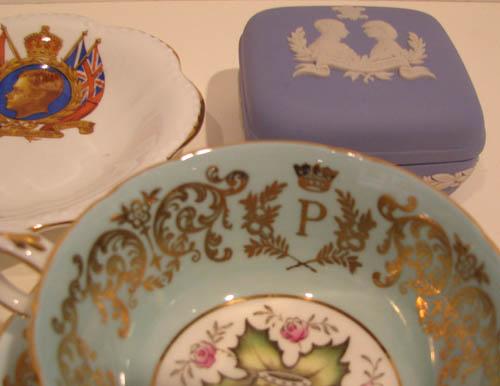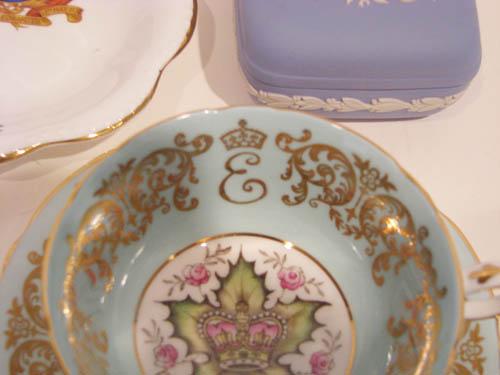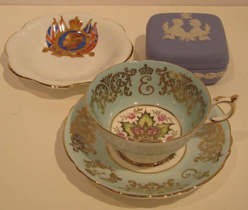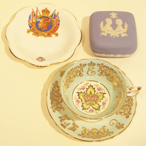 Title: Queen Wlizabeth II Saucer and Cup, King Edward small Saucer & Wedgewood small lidded box Charles and Dianna Royal Wedding