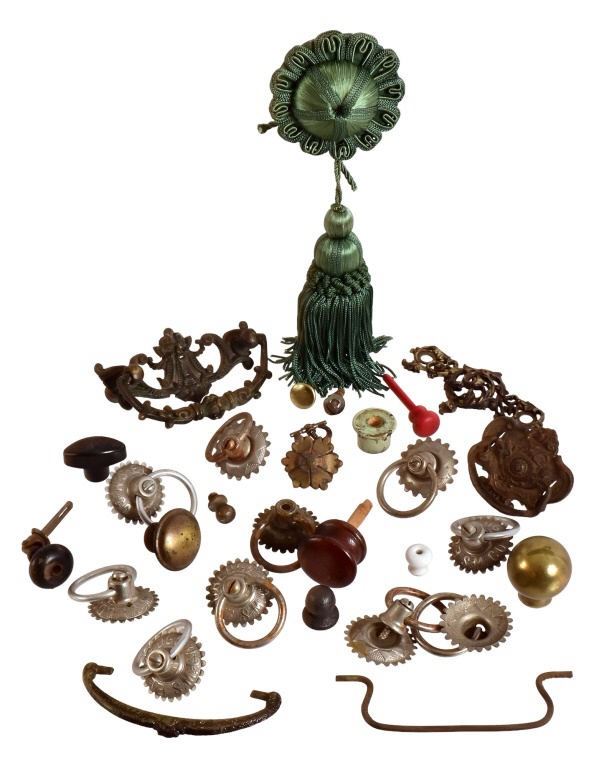Large Collection of Cabinet Pulls and Knobs. Metal and Wood. Various conditions.