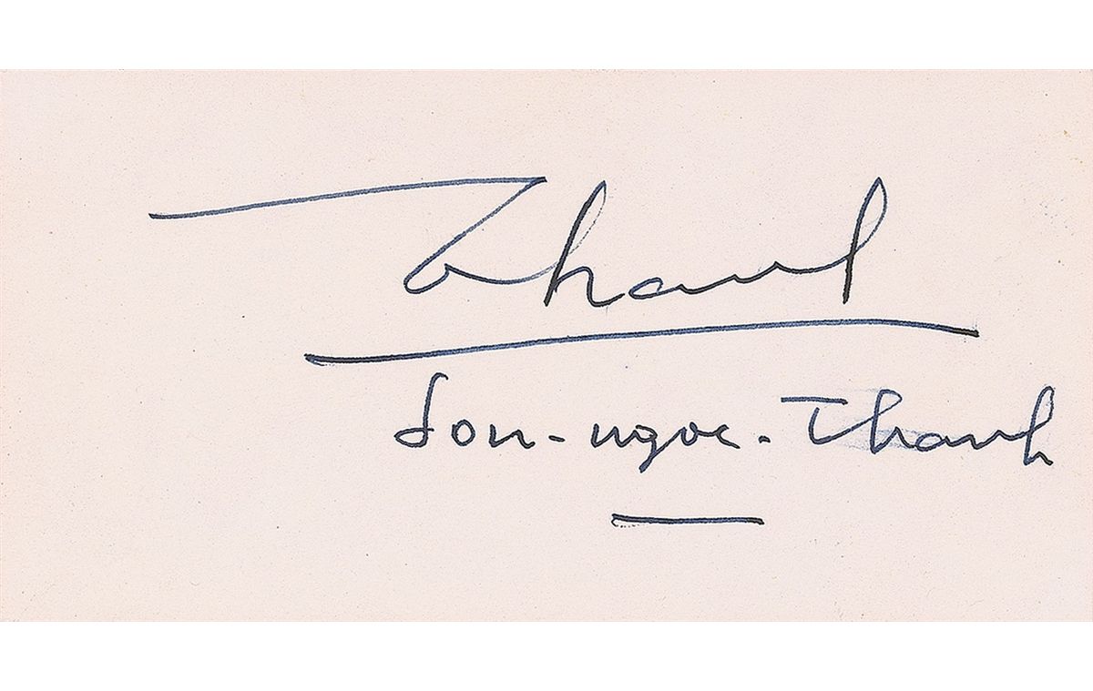 Collection of five items, each signed by a Cambodian prime minister, including: Lon Nol (SP), who was prime minister from 1966 to 1967 and 1969 to 1971; Son Ngoc Thanh (signature), who briefly served as prime minister in both 1945 and 1972; Pen Sovan (compliment card), who briefly served as prime minister in 1981; Hun Sen (very early SP), currently serving as prime minister; and Son Sann (SP), an anti-communist resistance leader who served as prime minister from 1967 to 1968. In overall fine condition. Accompanied by a transmittal letter from the office of Son Ngoc Thanh.