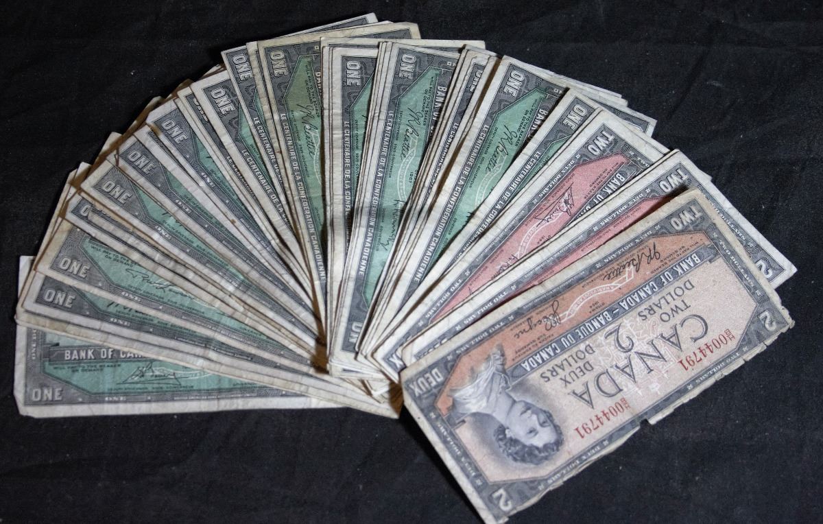 Collection of Canadian Bank Notes - $50 Face Value - 1954 $1 Modified (14), 1954 $2 Modified (4), 1954 $2 Devil's Face, 1967 $1 Serial #'s (26) - All In G - VG+ Condition