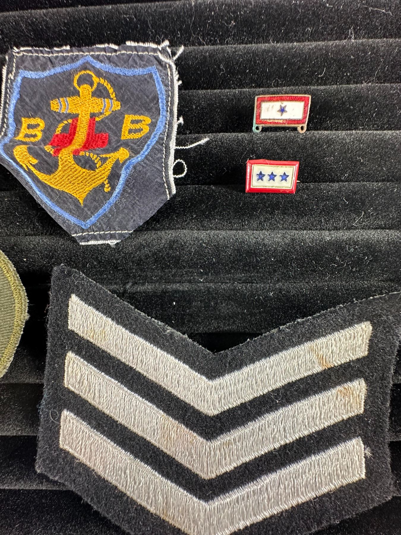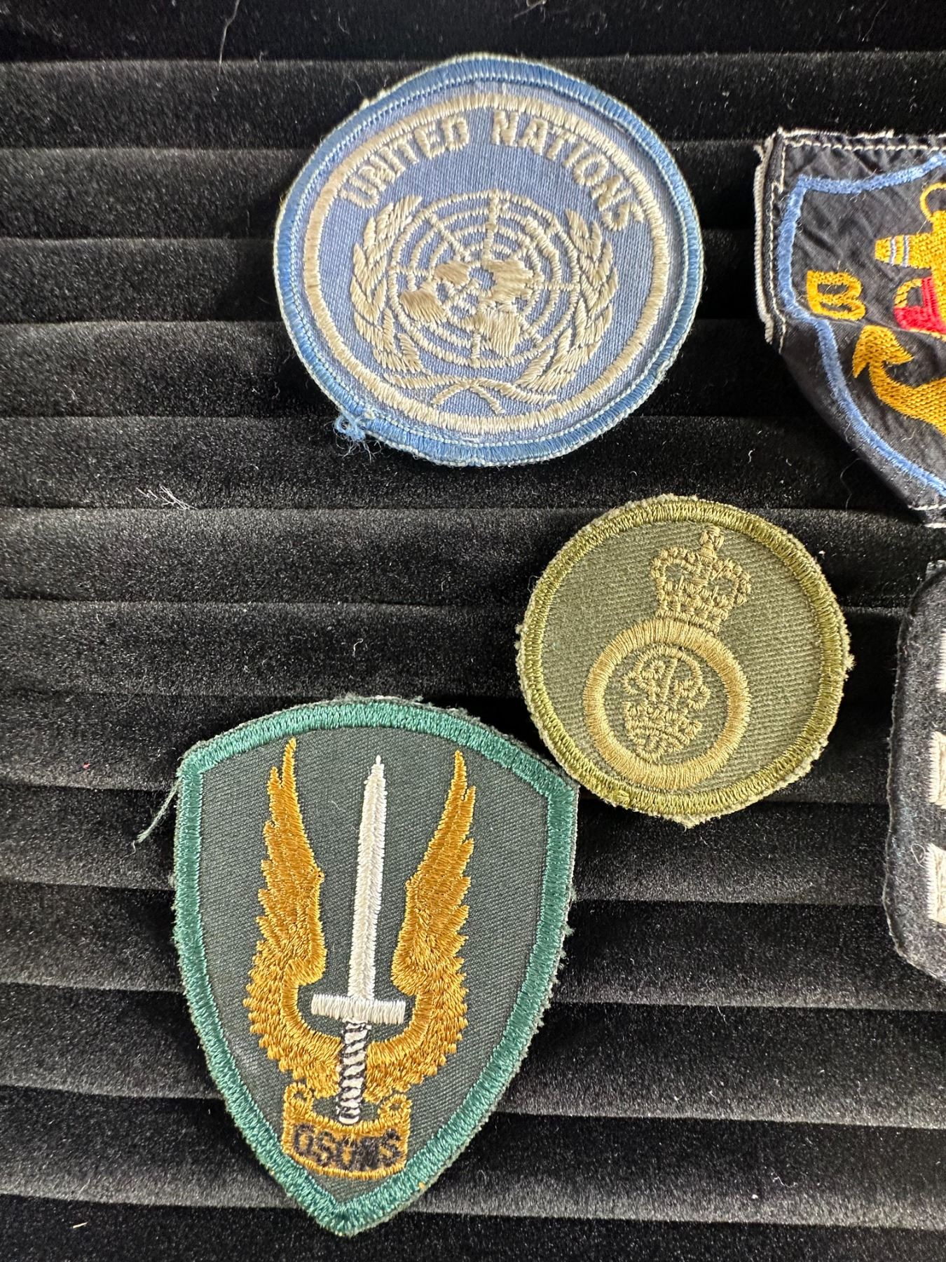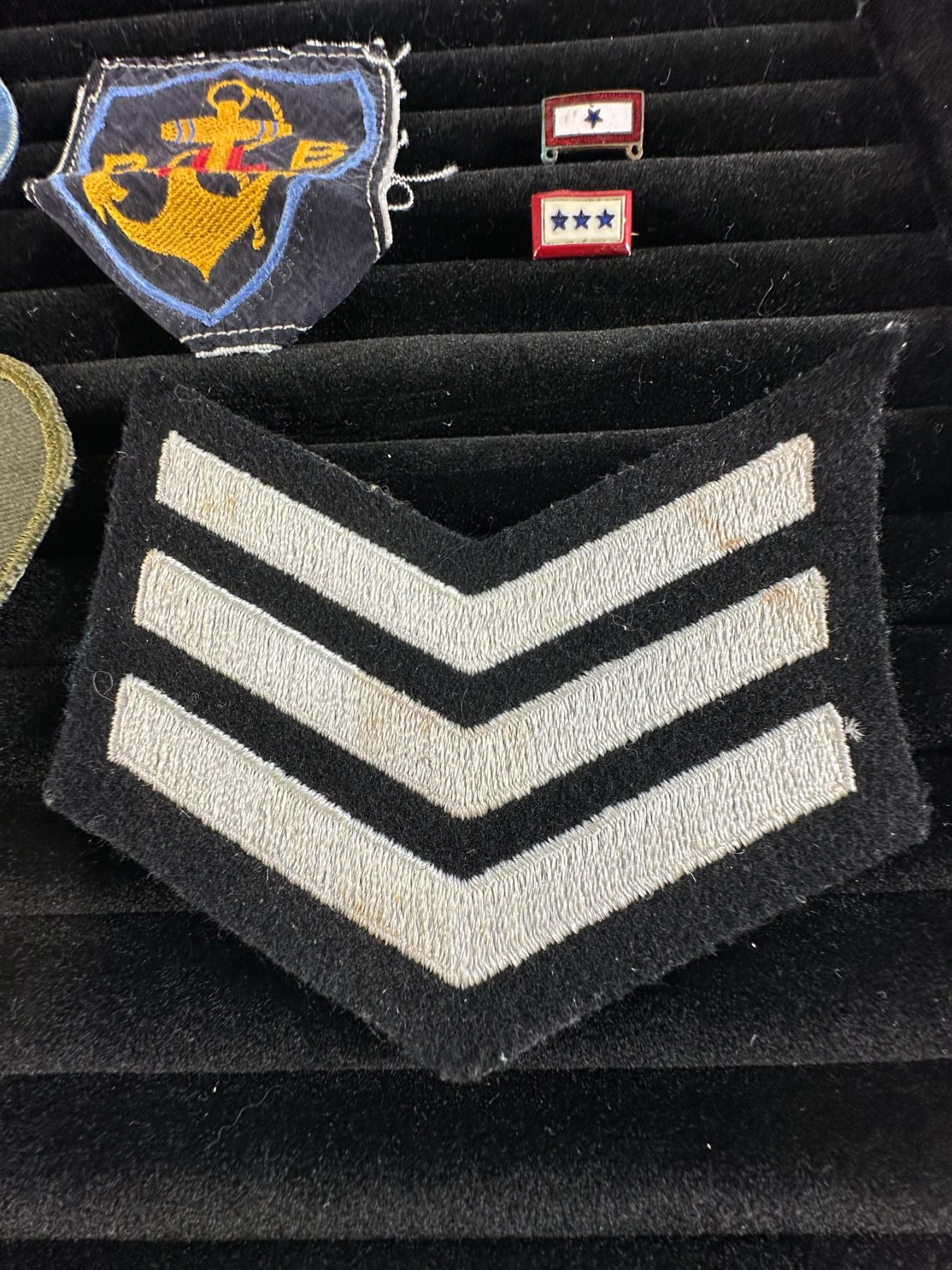 Set of seven embroidered rank and service patches featuring crowns, chevrons, and laurel wreath emblems from Canadian Army and Air Force uniforms. Condition: Good overall with some edge wear.