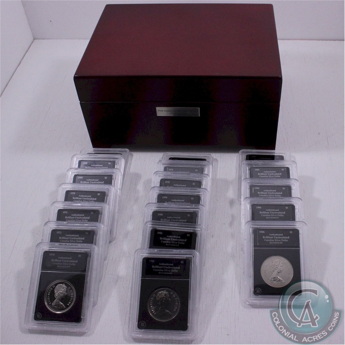 Collection of Canadian Silver Dollars minted from 1968-1986 with and additional 1953 dollar. This set includes the 1953, 1968,1969,1970,1971,1972,1974,1975,1976,1978,1979,1980,1981,2x 1982,1983, 2x 1984 and 1986 .Each coin is individually encapsulated in a crystal-clear tamperproof holder that allows you to view both sides as well as a Stunning hardwood Deluxe Collector's Display Box with a rich mahogany stain and silver-finished title plaque and hinges. 19pcs