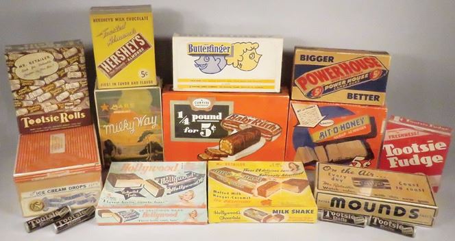 Collection of Candy Boxes. Baby Ruth, Bit-O-Honey, Tootsie Rolls box and (4 faux rolls), Tootsie Fudge, Hollywood, Milk Shake, Milky Way, Butterfinger, Mounds, Power House, Hershey's and Schrafft's Blue Banner box.