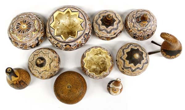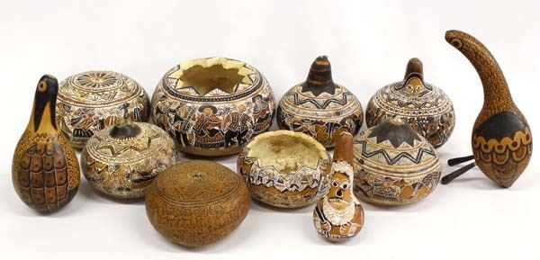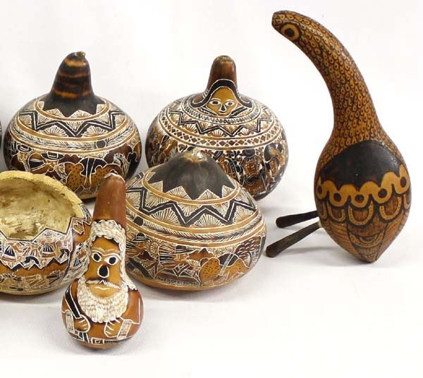 Collection of Carved Peruvian Gourds, very intricate details, largest measures 5'' x 3'', includes birds and Santa Claus