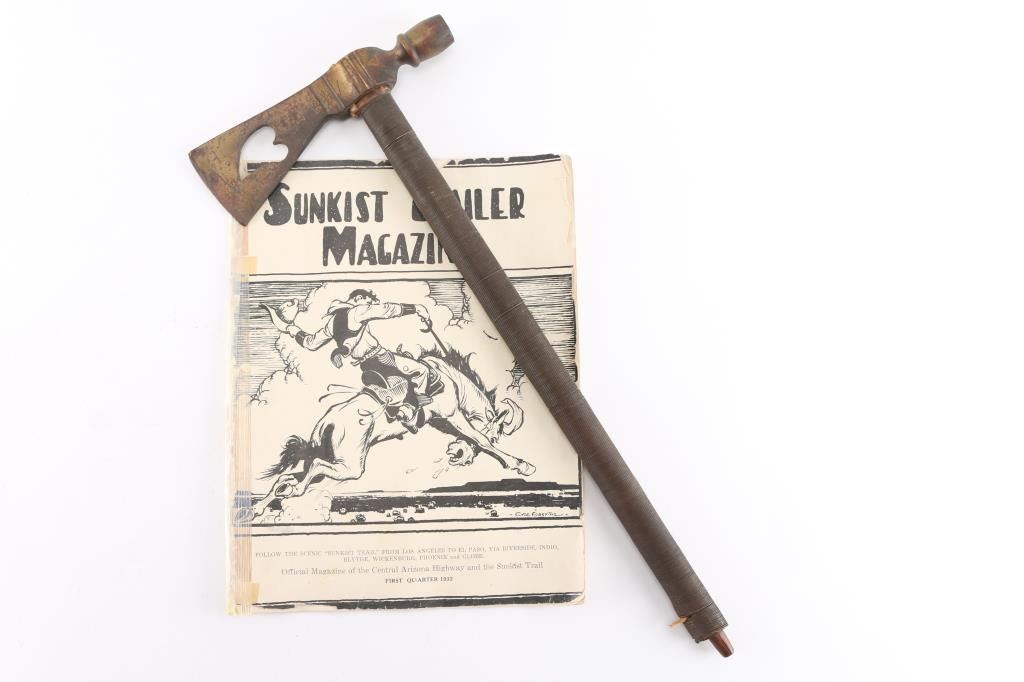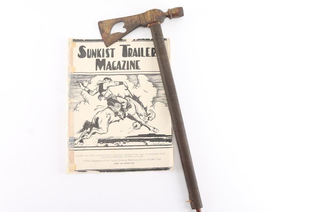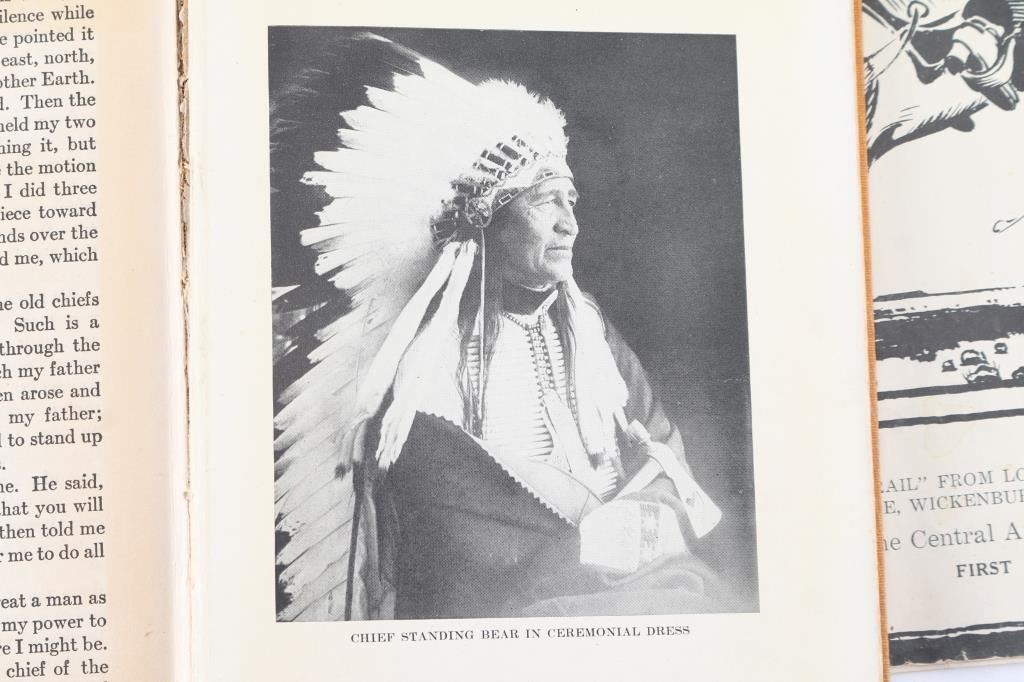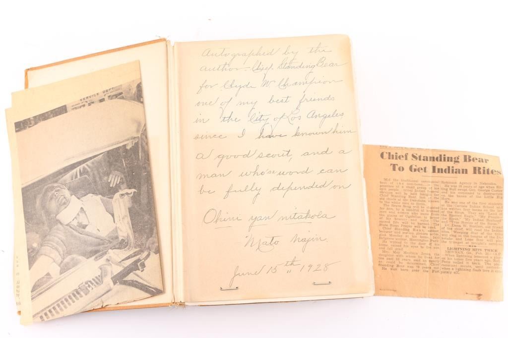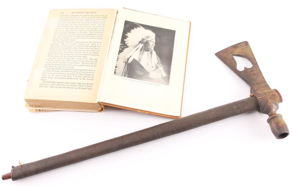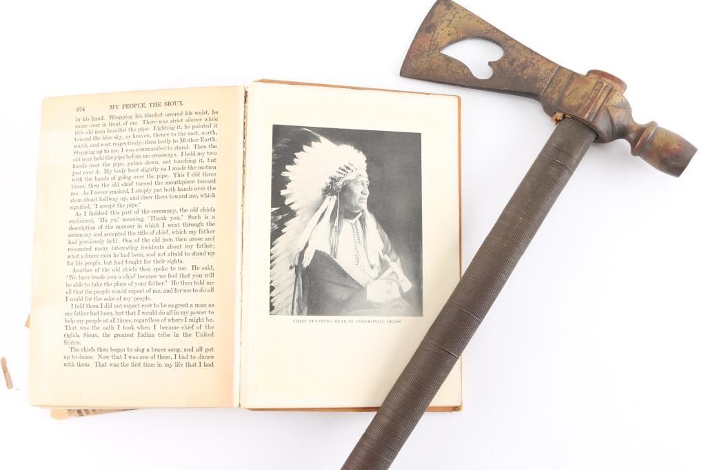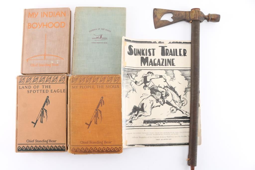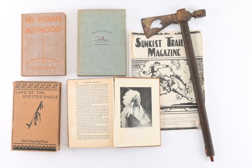 Including books, magazine, and tomahawk. The pipe tomahawk appears to be all original, metal contraction wire wrapped wood handle. Pictured with Chief Standing Bear holding this tomahawk in his book "My People the Sioux" on page 275. Also included is the Sunkist Trails Magazine, Stories of the Sioux book, My Indian Boyhood book, and The Land of the Spotted Eagle book. All of this was given to our consignor's grandfather, Mr Clyde Champion around 1928-1934. This lot is a unique piece of history and a wonderful collection.