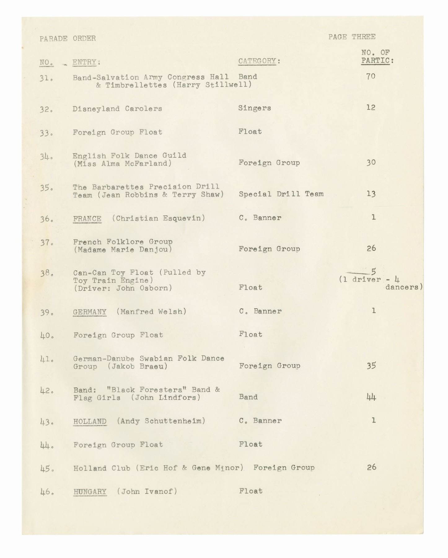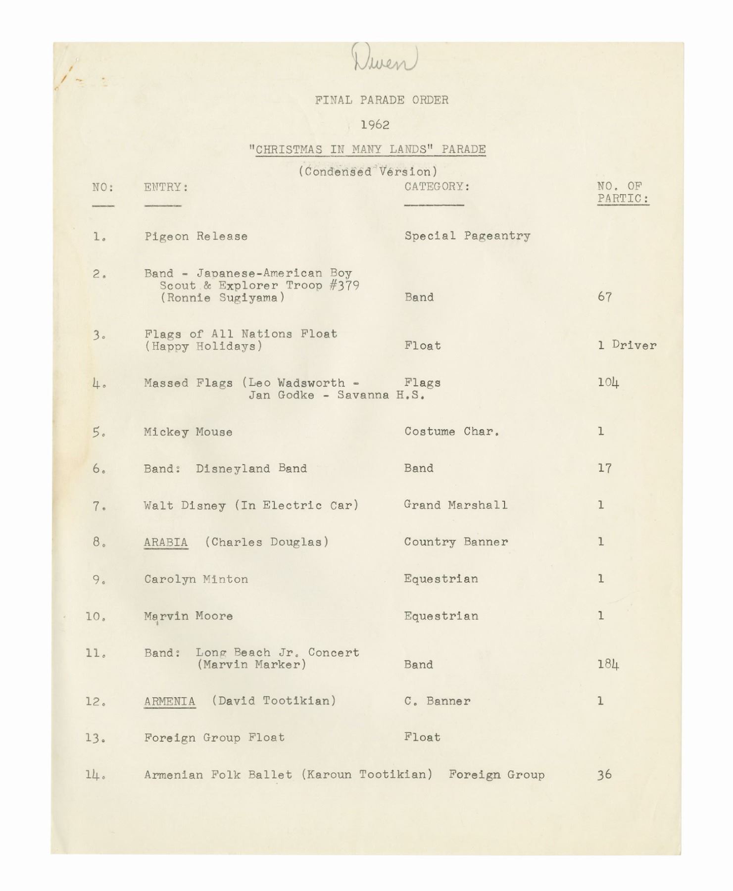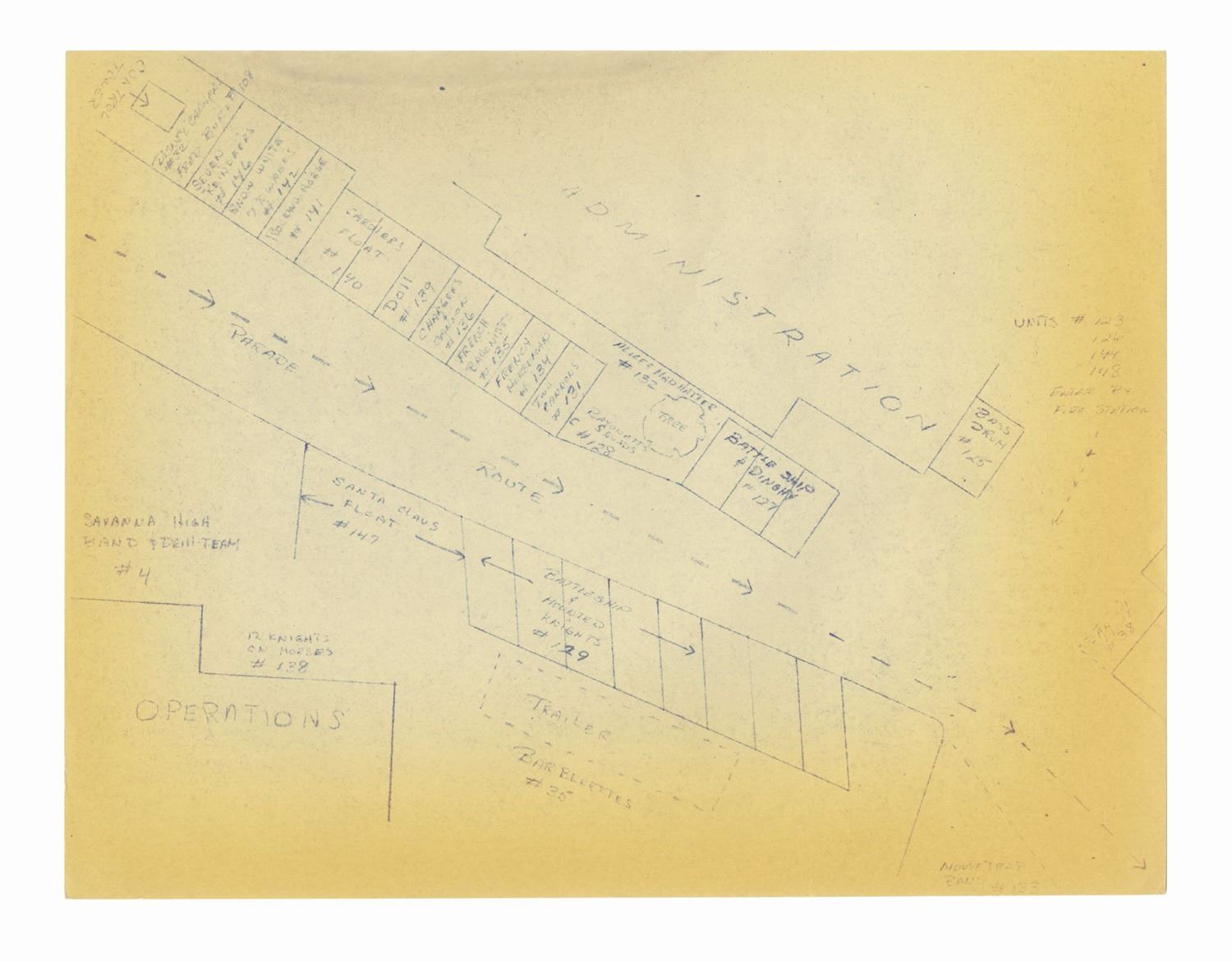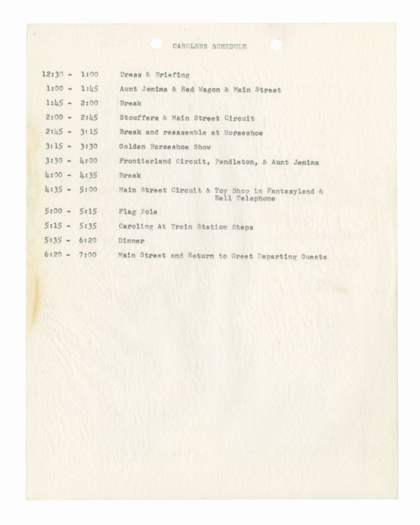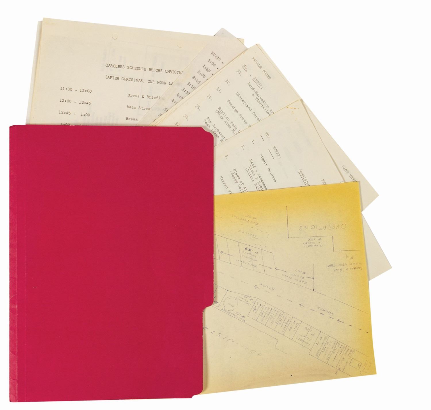 (Disneyland, 1962) A collection of WED documents used in the planning of the 1962 Christmas in Many Lands parade. The documents include an itinerary for the parade, a list and schedule for the cast member carolers, and a brownline map of the parade route. The (20) documents measure 11"x8.5" and are in good condition with some yellowing to the map, and handling wear to the pages.