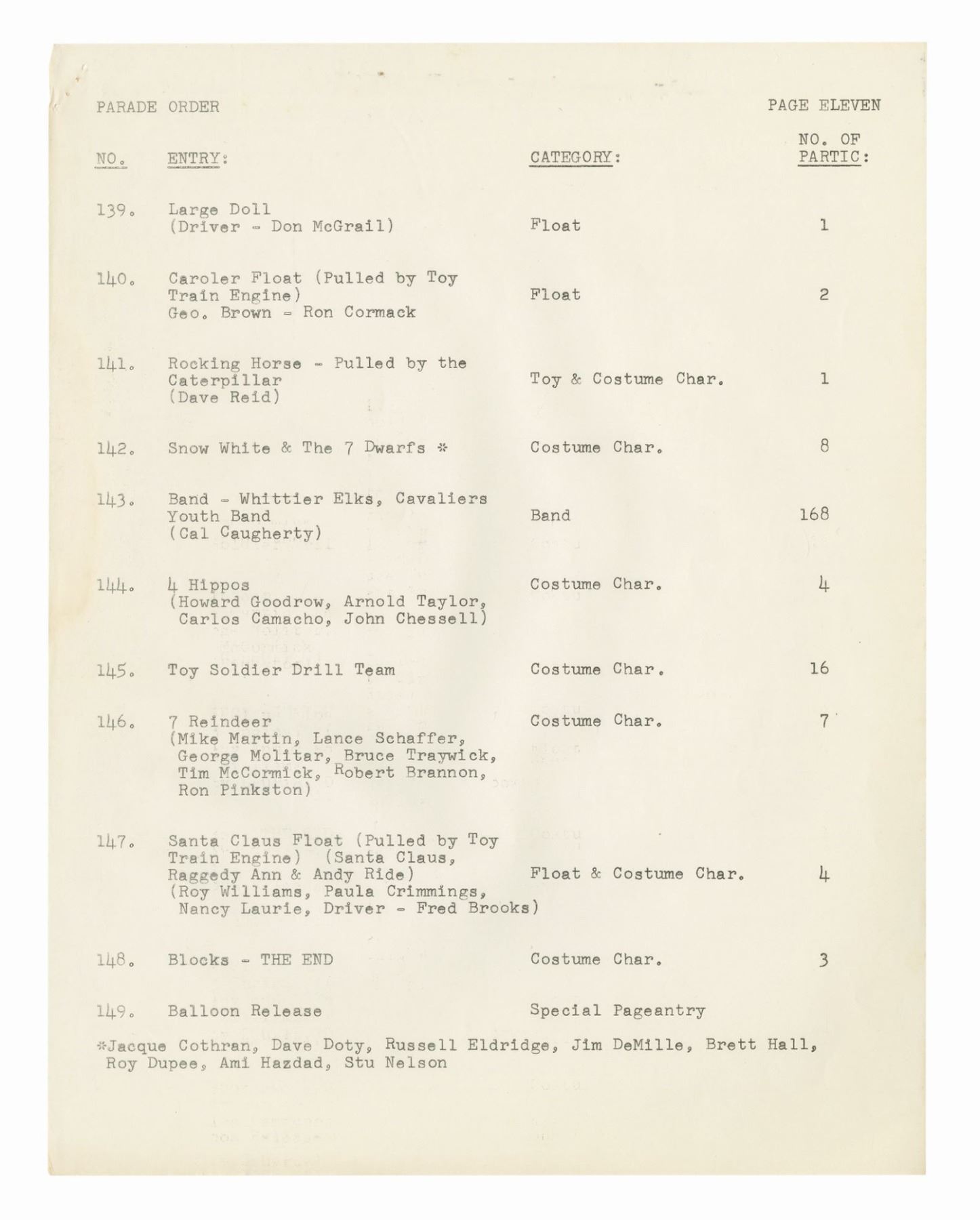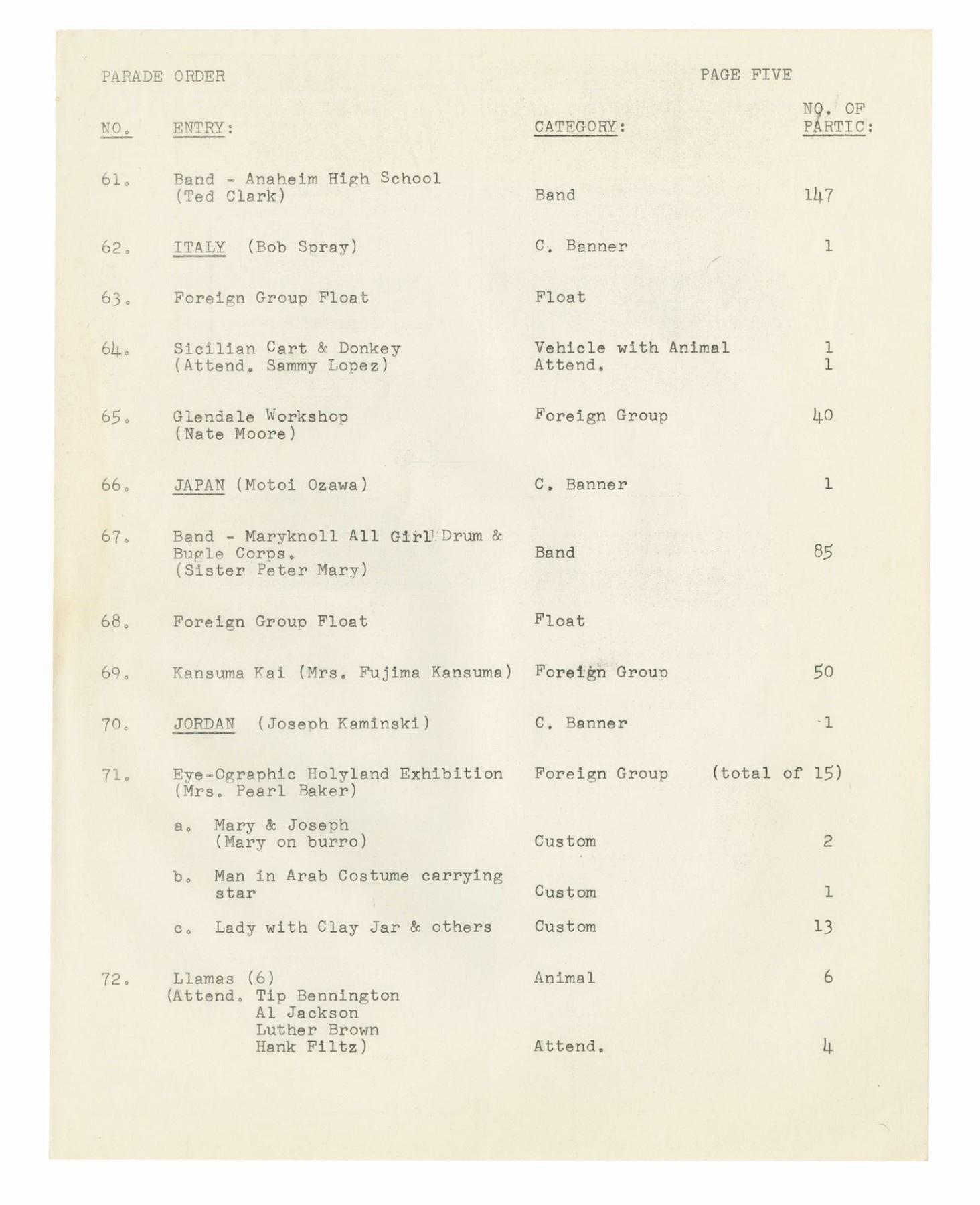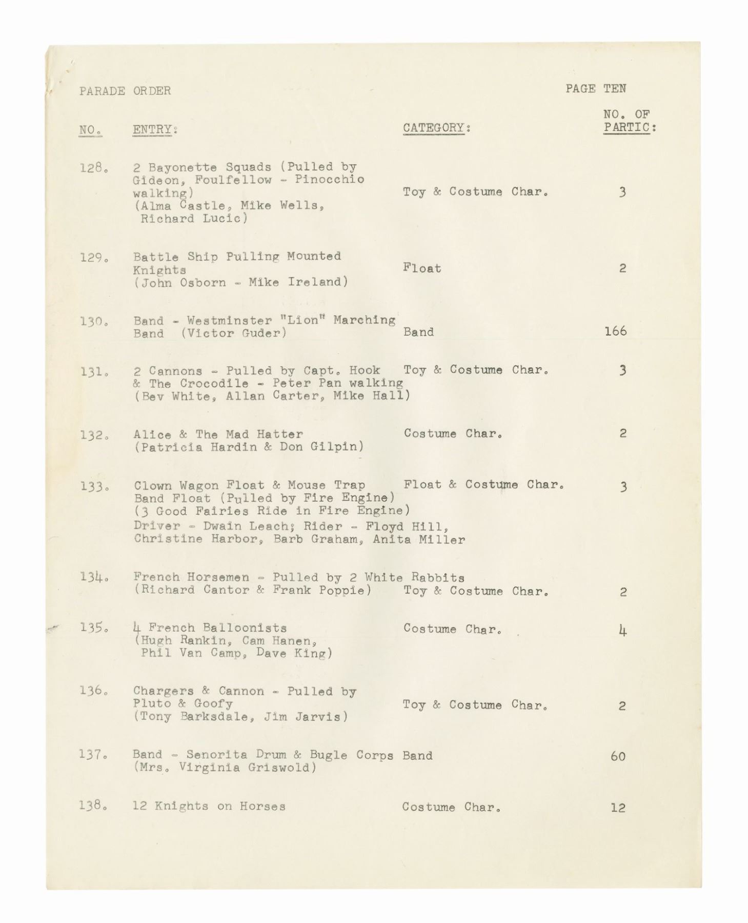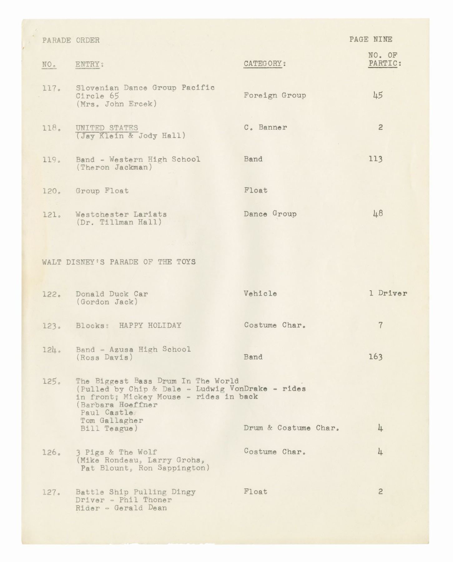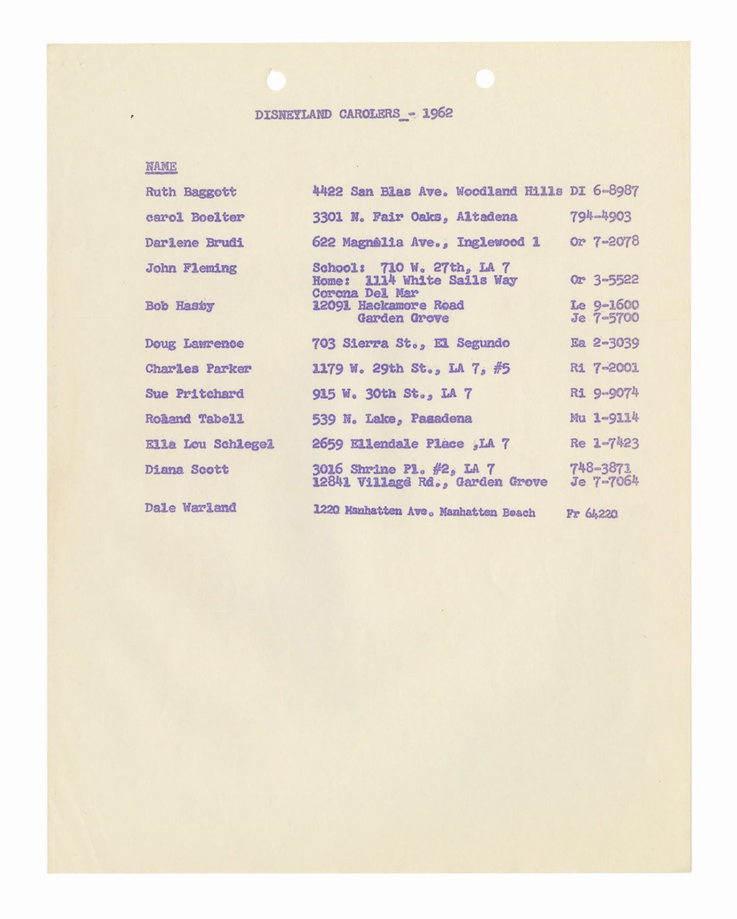 (Disneyland, 1962) A collection of WED documents used in the planning of the 1962 Christmas in Many Lands parade. The documents include an itinerary for the parade, a list and schedule for the cast member carolers, and a brownline map of the parade route. The (20) documents measure 11"x8.5" and are in good condition with some yellowing to the map, and handling wear to the pages.
