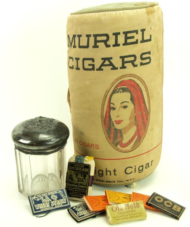 original Muriel Cigars advertising pillow, pressed clear glass tobacco humidor with silver plated lid, early Durham tobacco pouch, original Old Gold Cigarettes, misc. early cigarette papers.