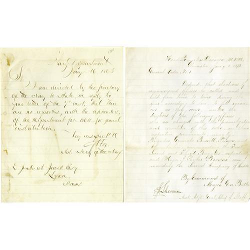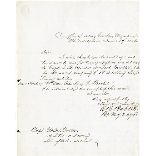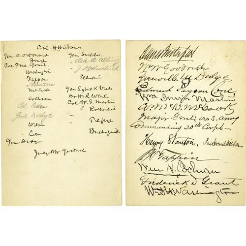 <B>Collection of 34 Civil War Autographs.</B></I> A rich and varied collection focused mainly on Union generals. Official documents, autographs, clipped signatures, letters and checks are presented here in a three-ring binder with short biographies of each subject. The material ranges in date from the antebellum years into the 20th century. Several of the personalities included are: Hannibal Day, Joseph Keifer, Adam Badeau, Randolph Marcy, Willam Buel Franklin, Joseph R. Hawley, John White Geary, Edward D. Townsend, S.V. Vliet, Albert Ordway and Robert C. Schenck. As with any large and disparate grouping condition varies widely among the contents. Overall the items are lightly aged and very good.<BR><BR><b>Shipping:</b> Books & Catalogs (<a target="_blank" href="http://www.heritageauctions.com/common/shipping.php">view shipping information</a>)