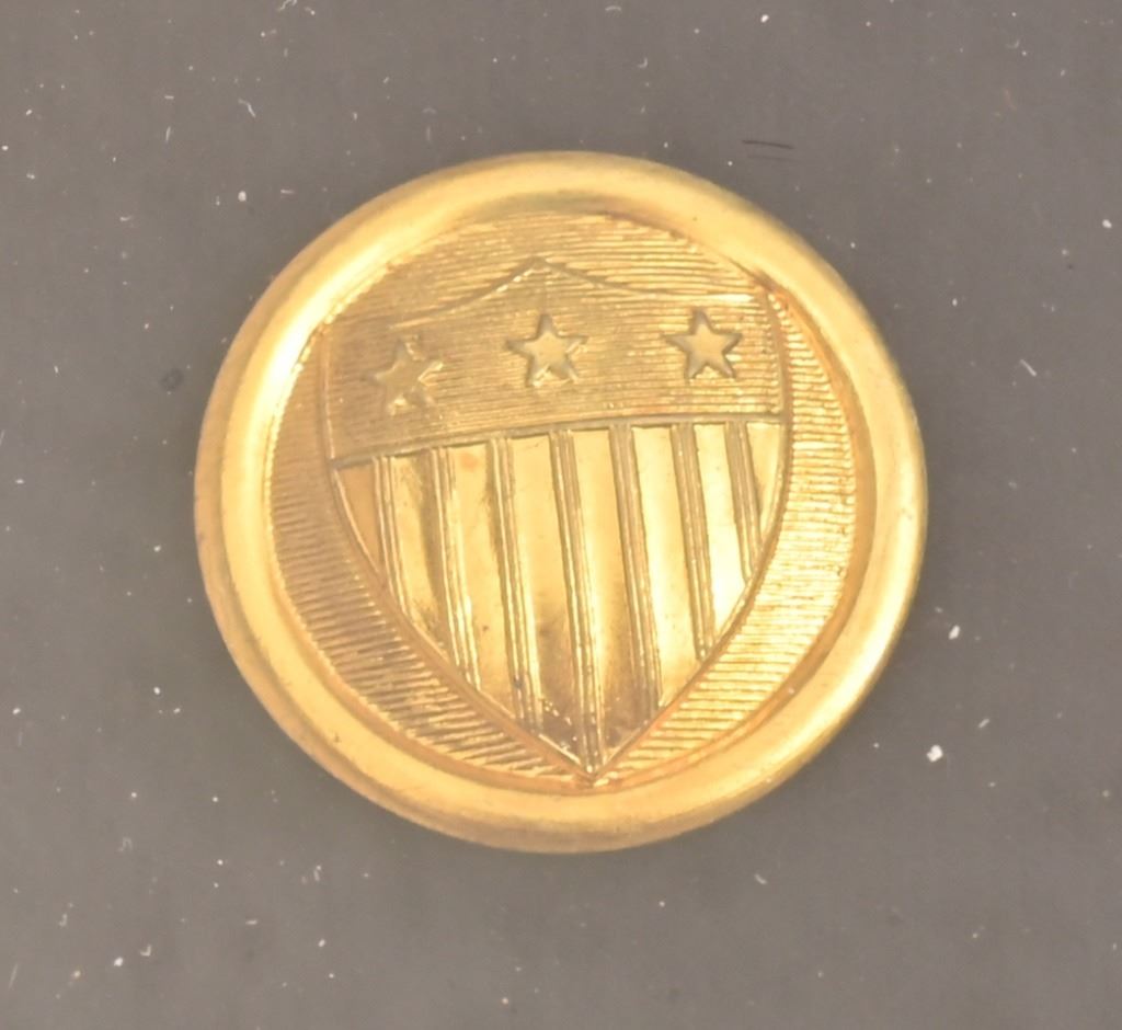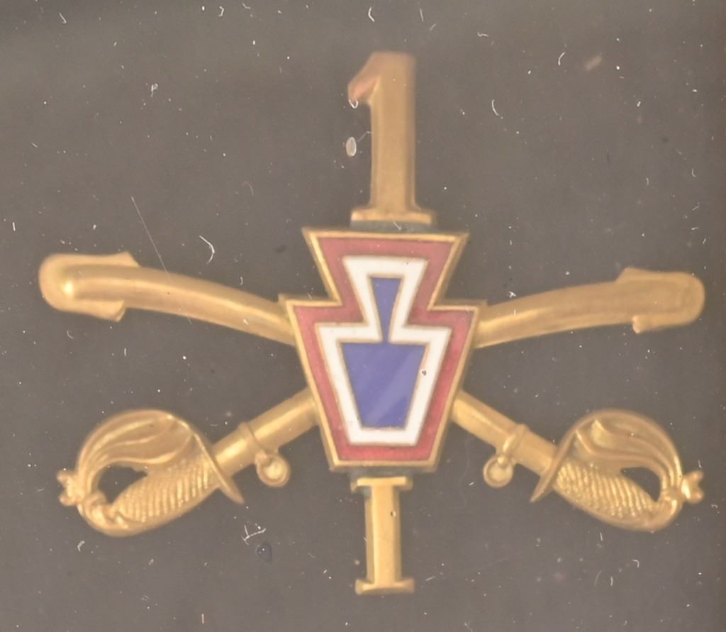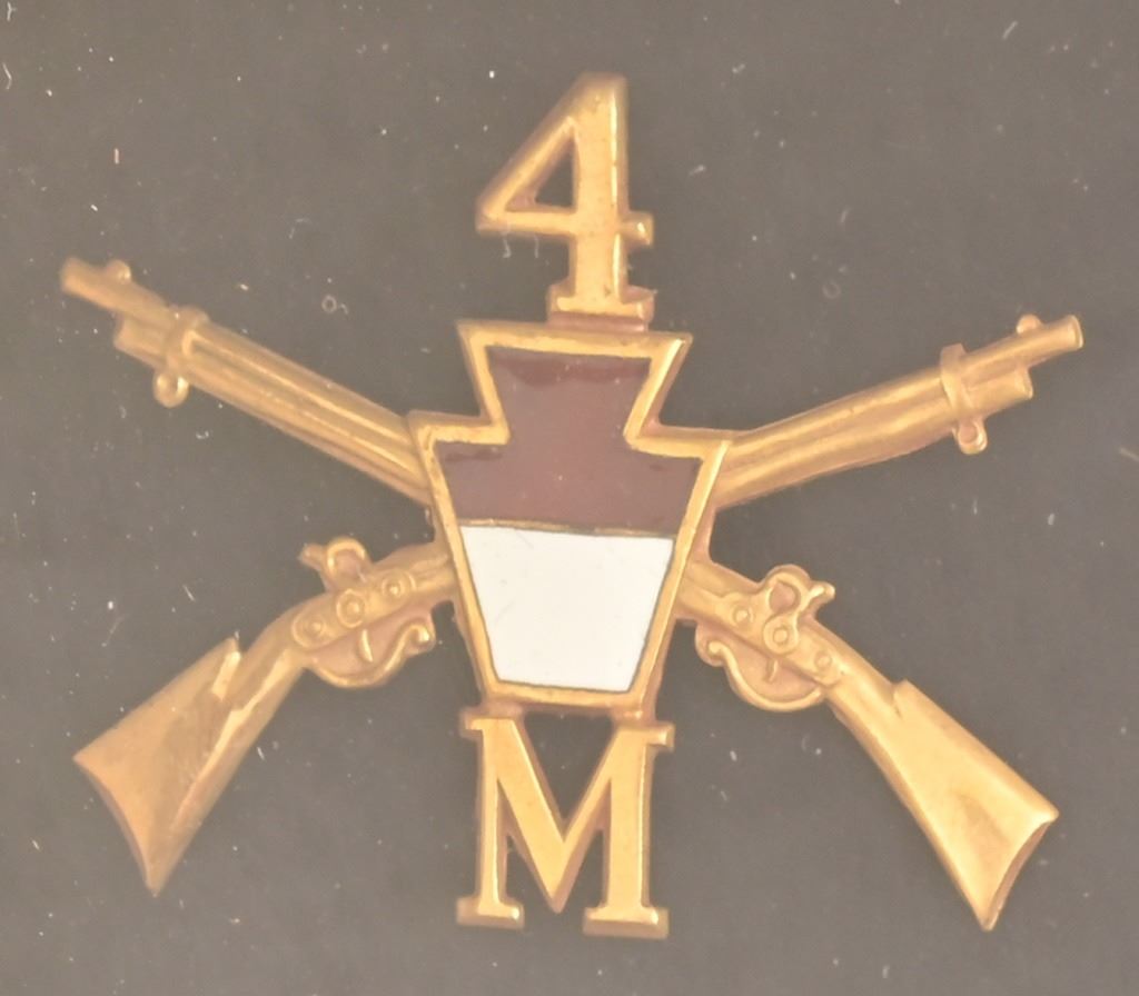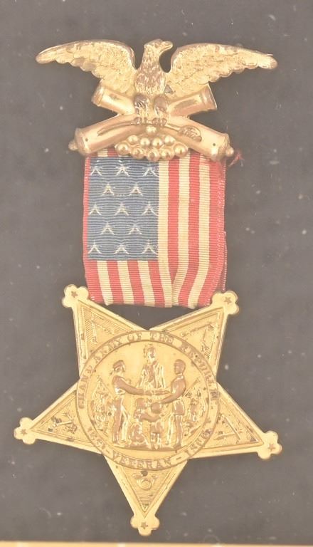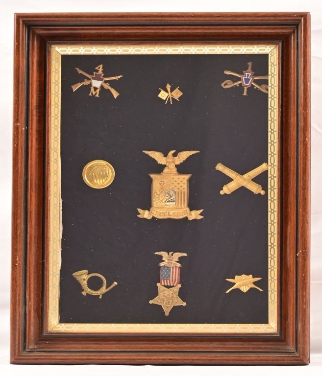 Grand Army of the Republic Veterans' Medal. New York State 2nd Excelsior Brigade Shako Cap Badge. First Cavalry Officer's Company I badge. 4th Infantry Regiment Company M badge.